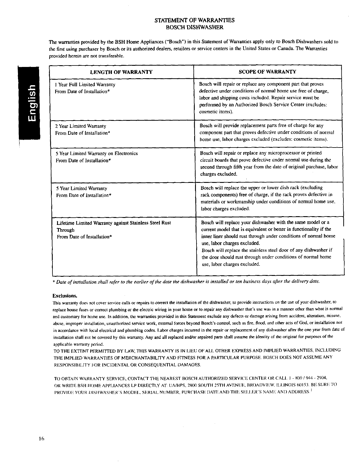 5 Year Limited Warranty on Electronics Bosch will repair or replace any microprocessor or printed
