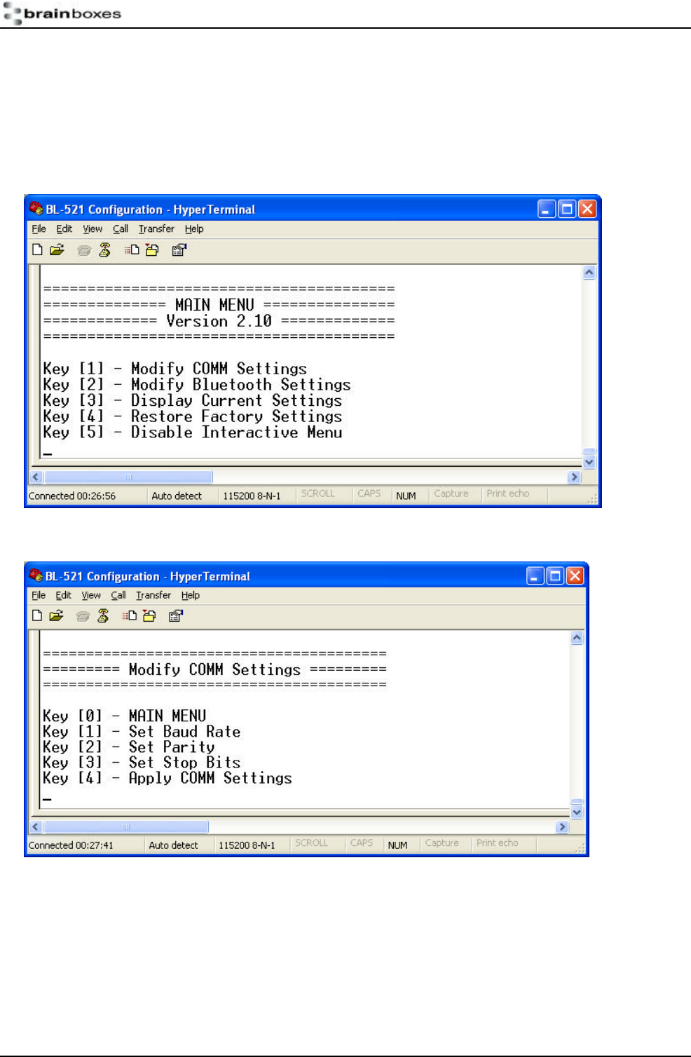Sending a single “Carriage Return” character to the BL-521 accesses the initial main menu.