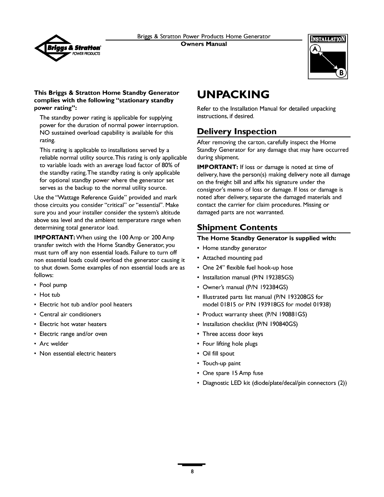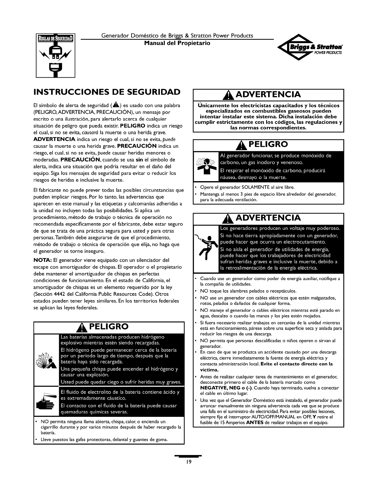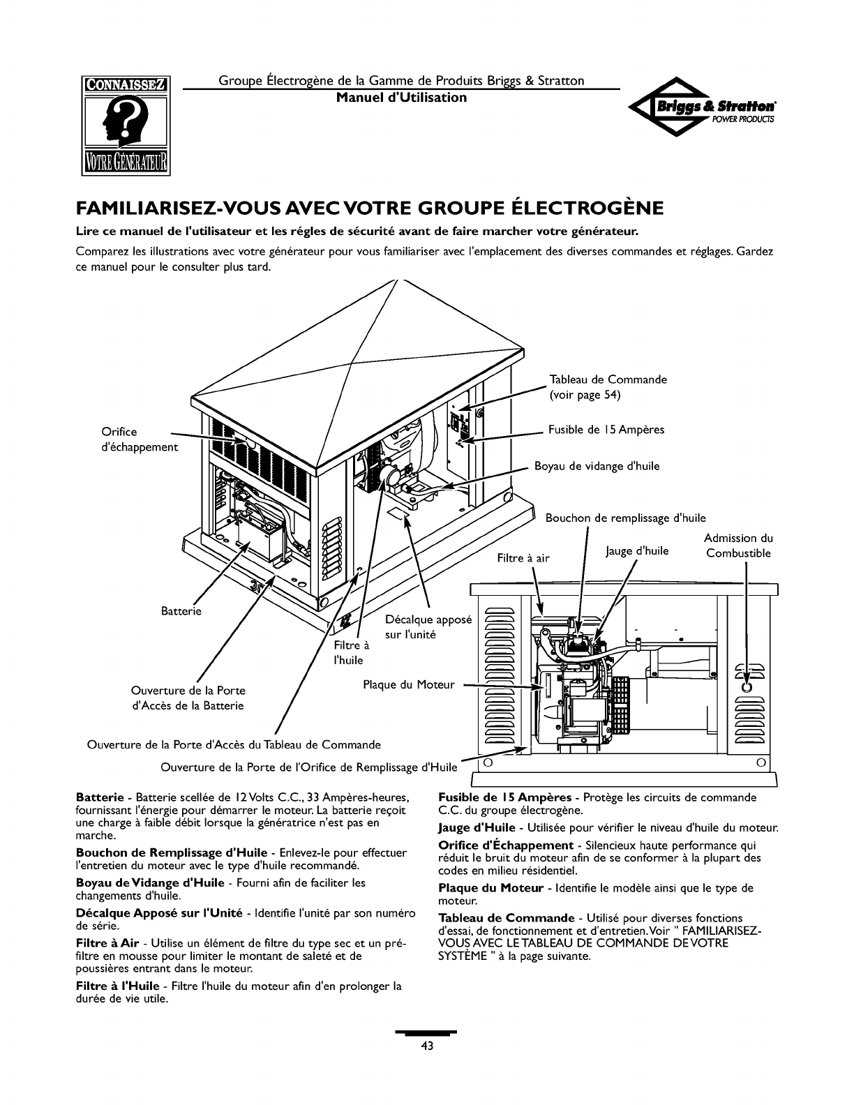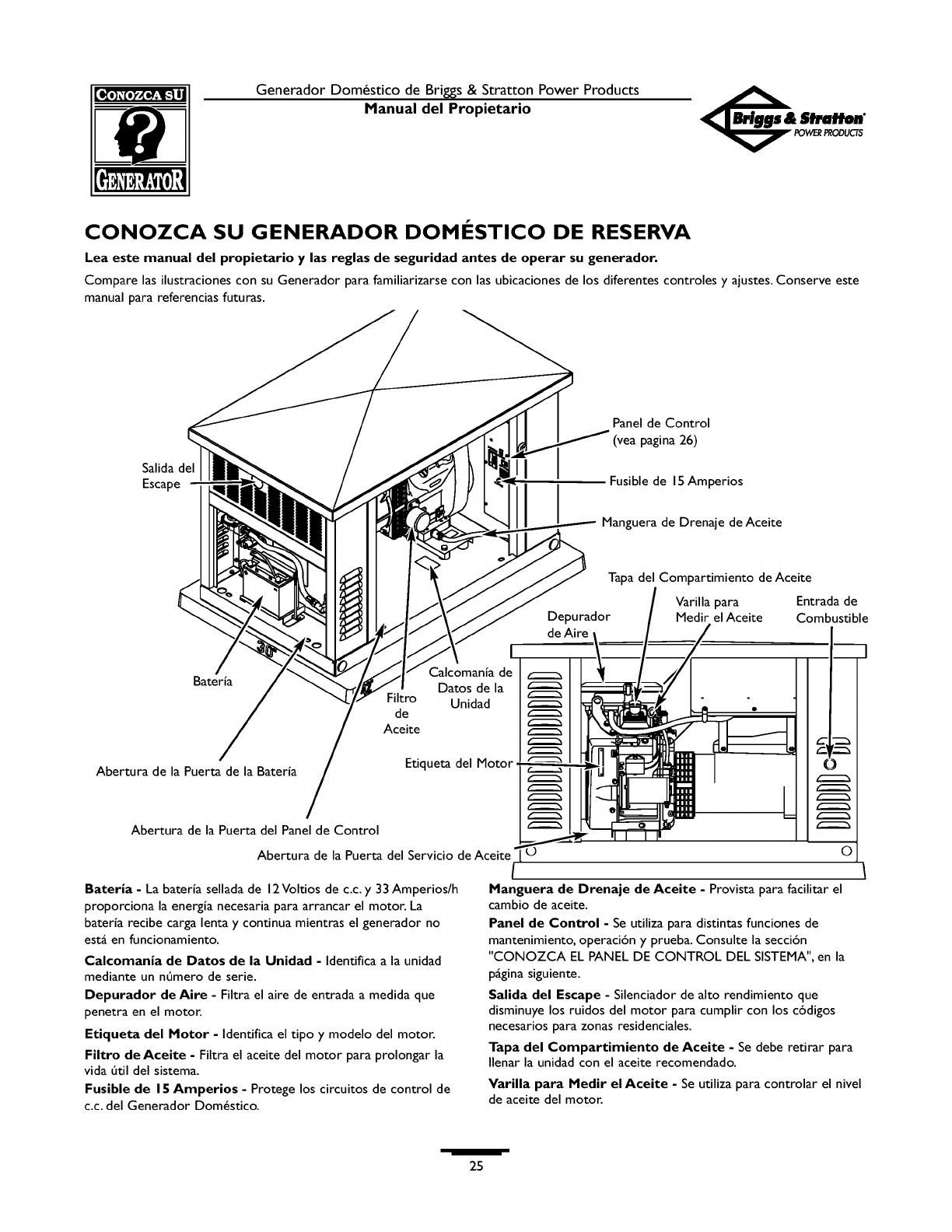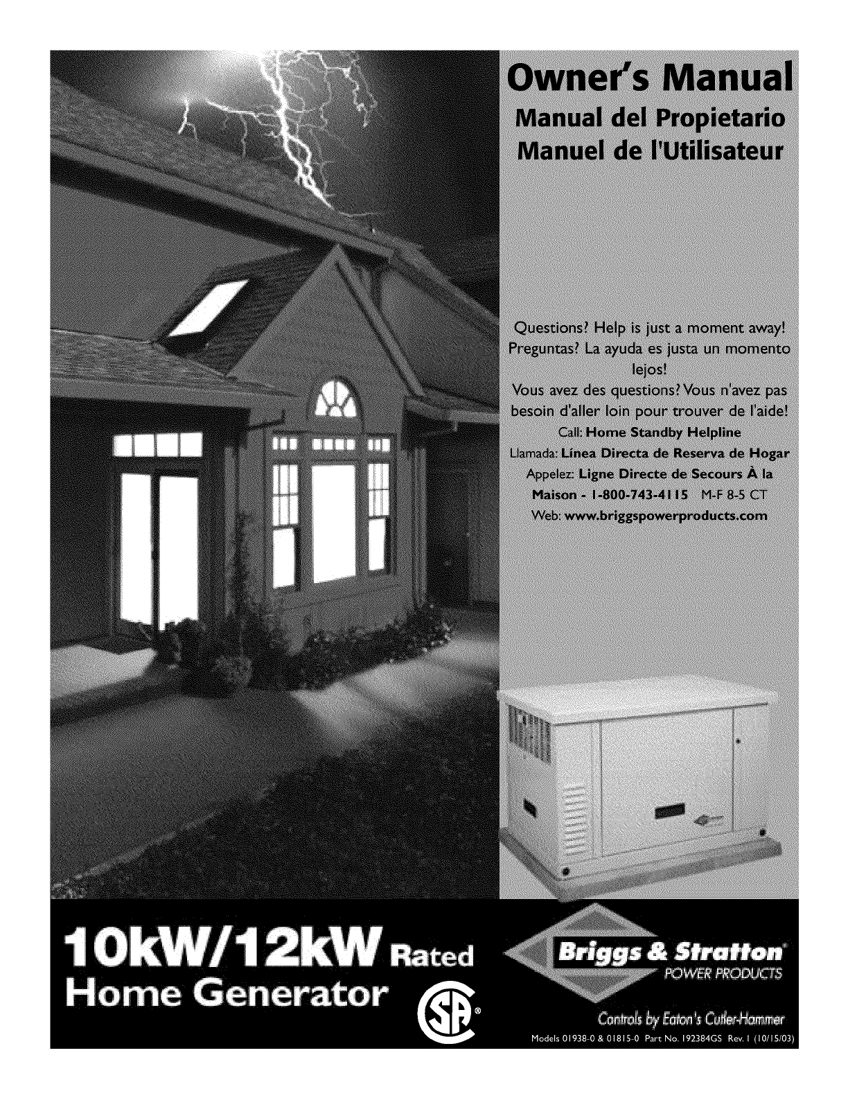 User Manual: Briggs & Stratton 01938-0 01938-0 BRIGGS & STRATTON HOME GENERATOR - Manuals and Guides View the owners manual for your BRIGGS & STRATTON HOME GENERATOR #019380. Home:Tool Parts:Briggs&Stratton Parts:Briggs&Stratton HOME GENERATOR Manual