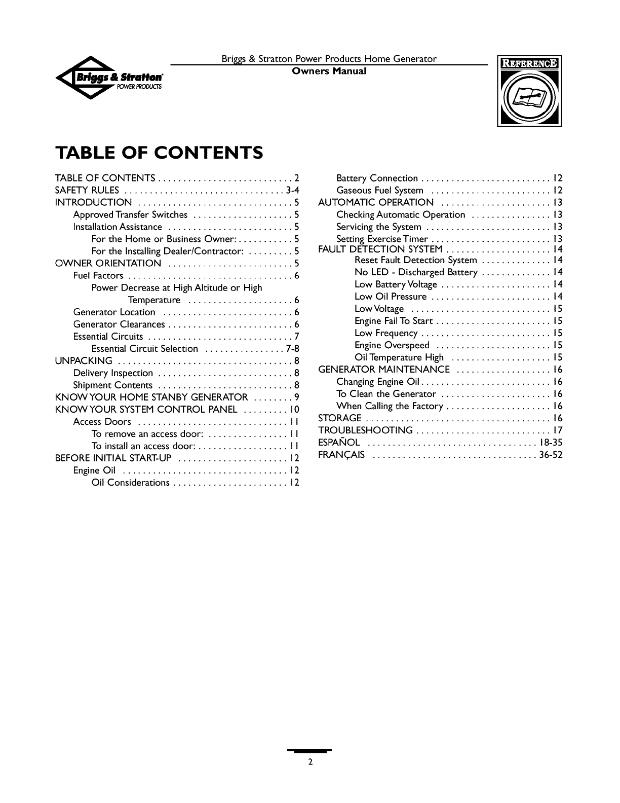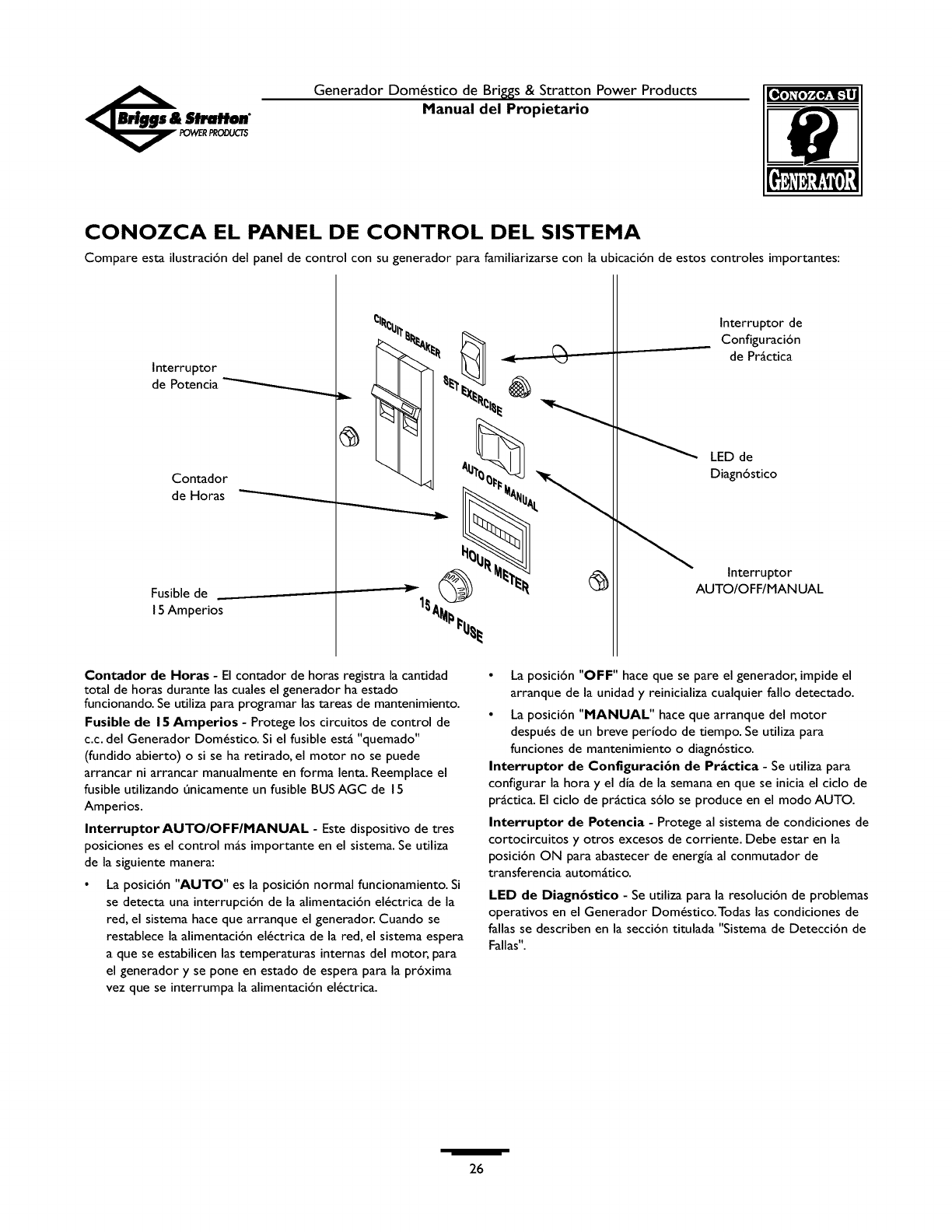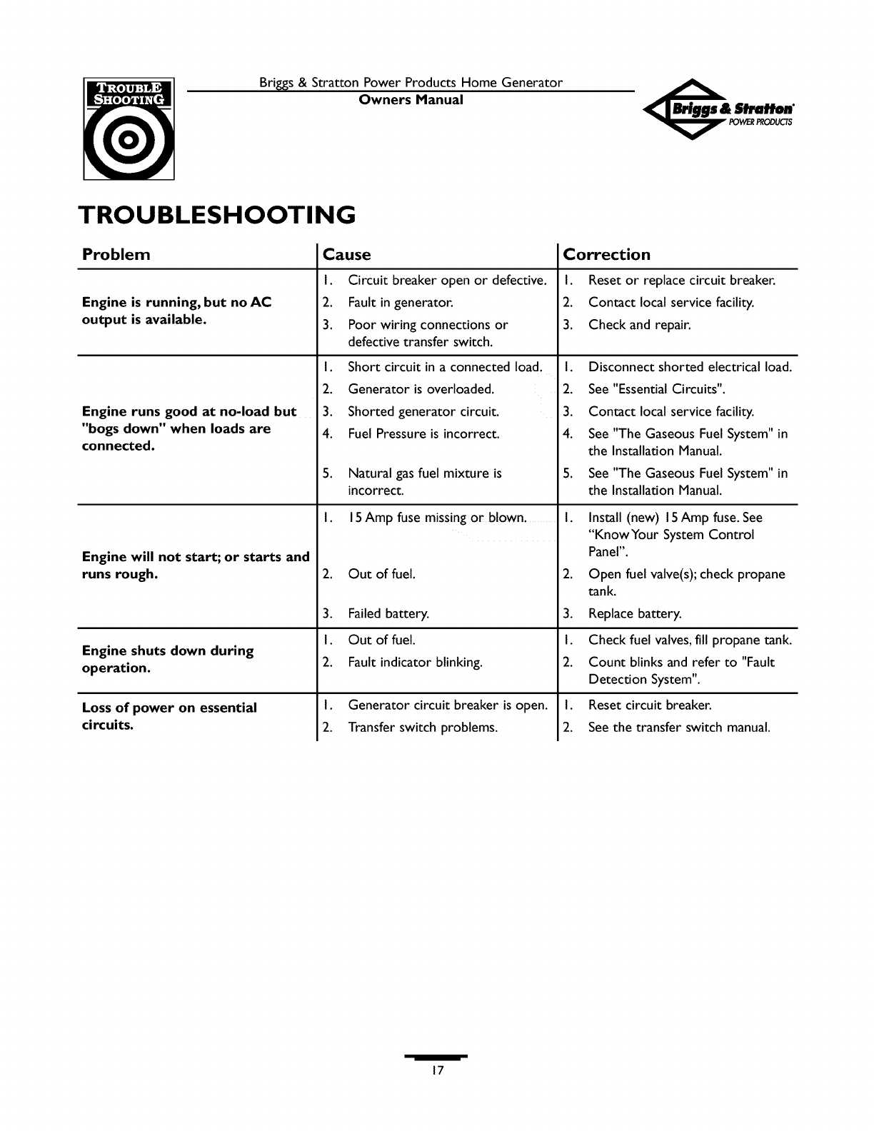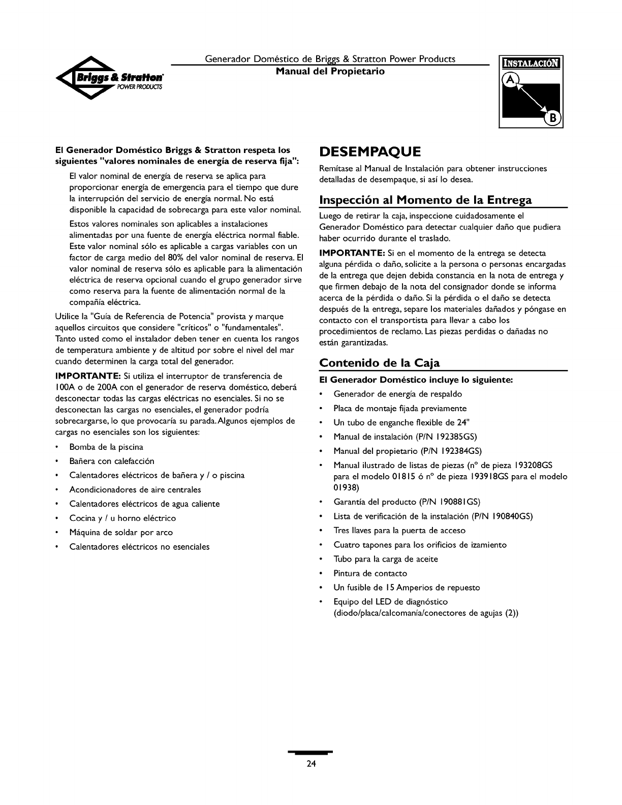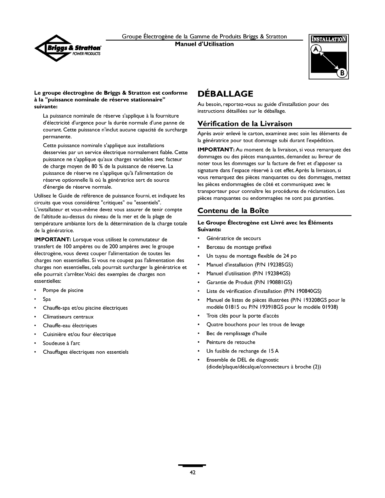 User Manual: Briggs & Stratton 01938-0 01938-0 BRIGGS & STRATTON HOME GENERATOR - Manuals and Guides View the owners manual for your BRIGGS & STRATTON HOME GENERATOR #019380. Home:Tool Parts:Briggs&Stratton Parts:Briggs&Stratton HOME GENERATOR Manual