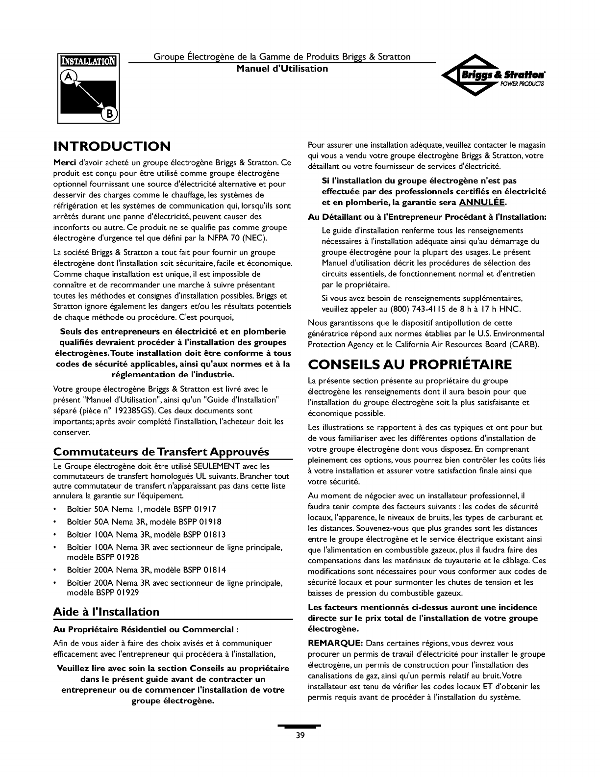 BRIGGS&STRATTON Generator Manual L0402147 BRIGGS&STRATTON Generator Owner's Manual, BRIGGS&STRATTON Generator installation guides