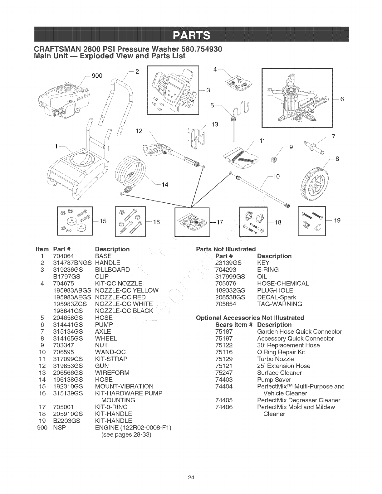 hoses, nozzle extensions, nozzles, spray tips, filters or spark plugs.