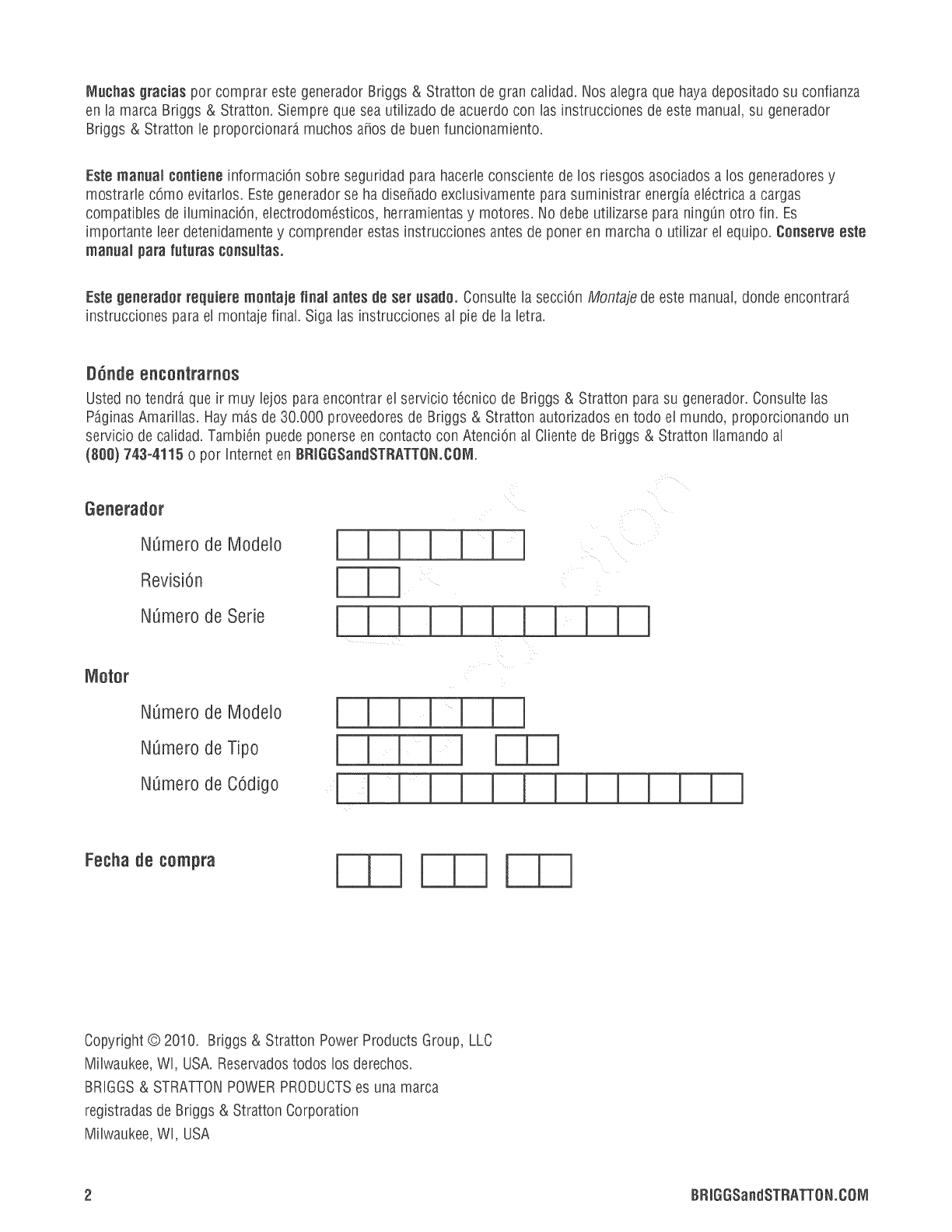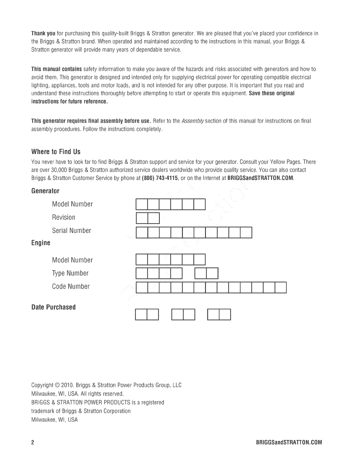Thank youfor purchasingthis quality-built Briggs & Stratton generator.We are pleasedthat you've placed your confidence in