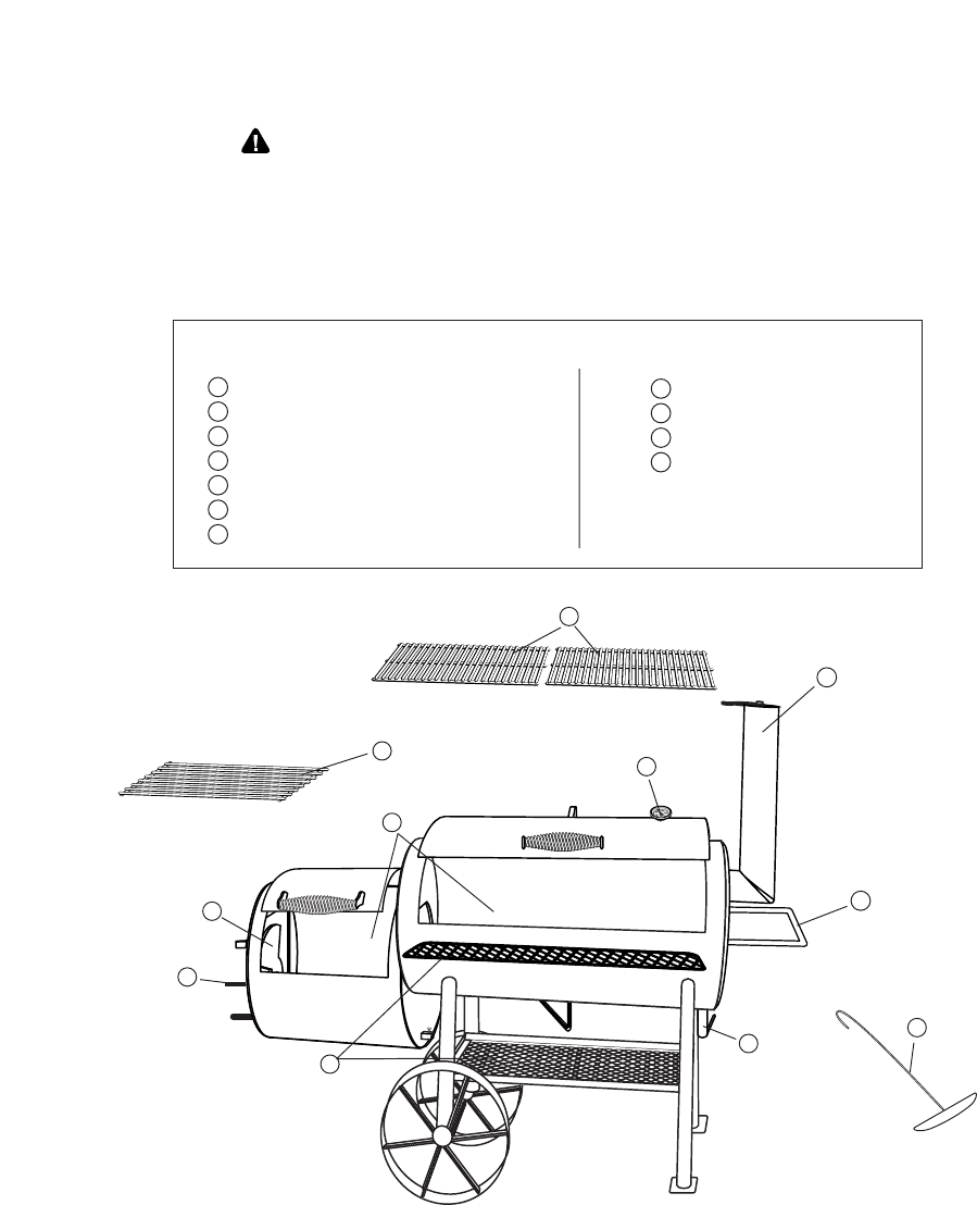 • Use caution when assembling and operating your smoker to avoid scrapes or cuts from sharp edges of metal parts.