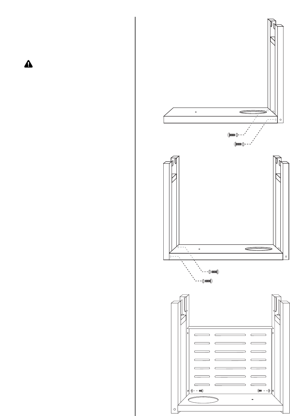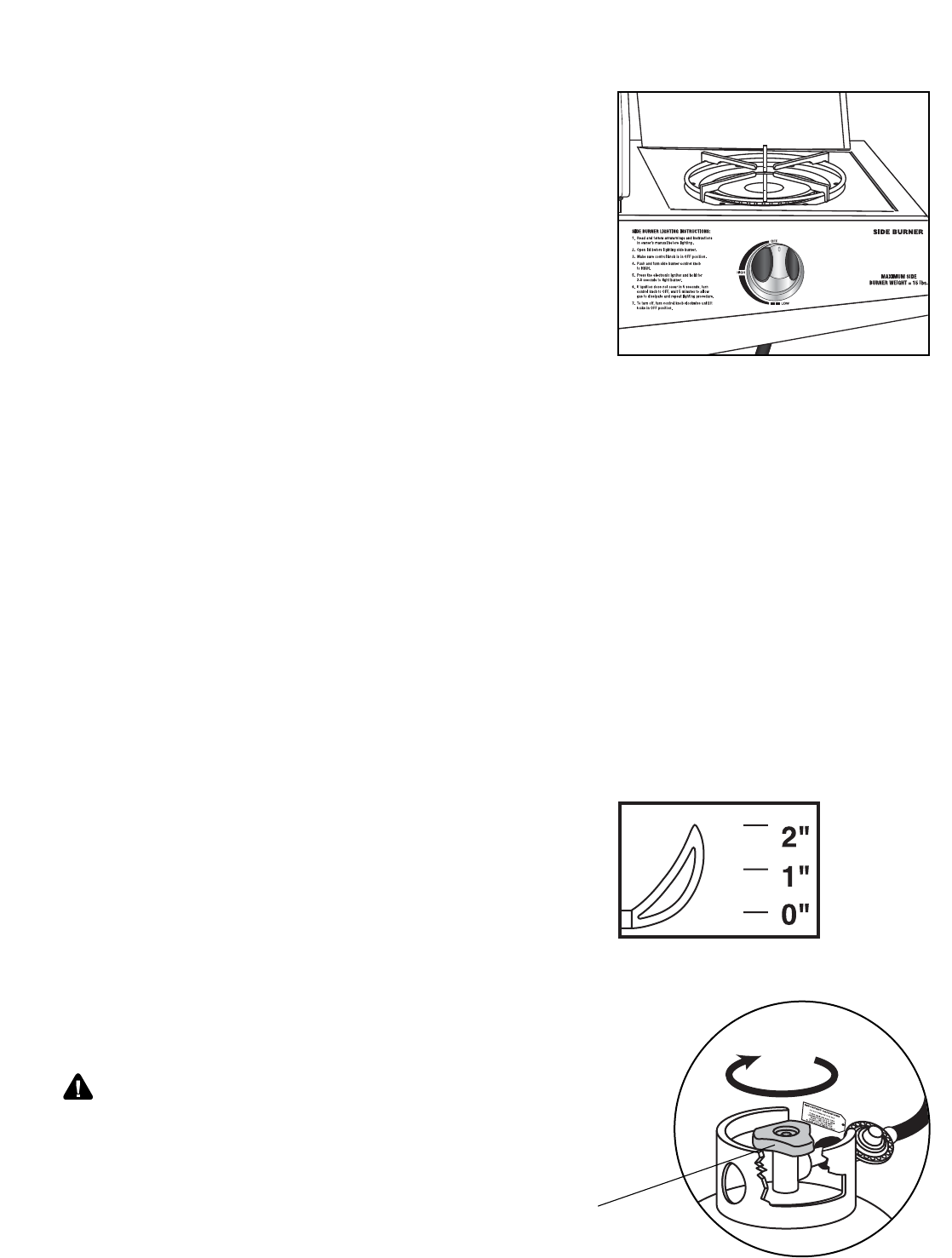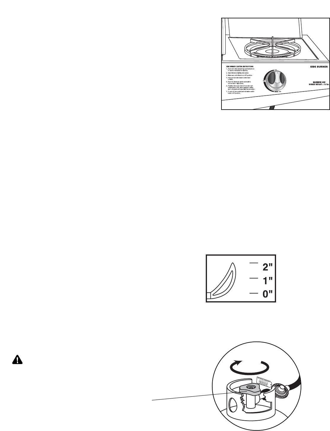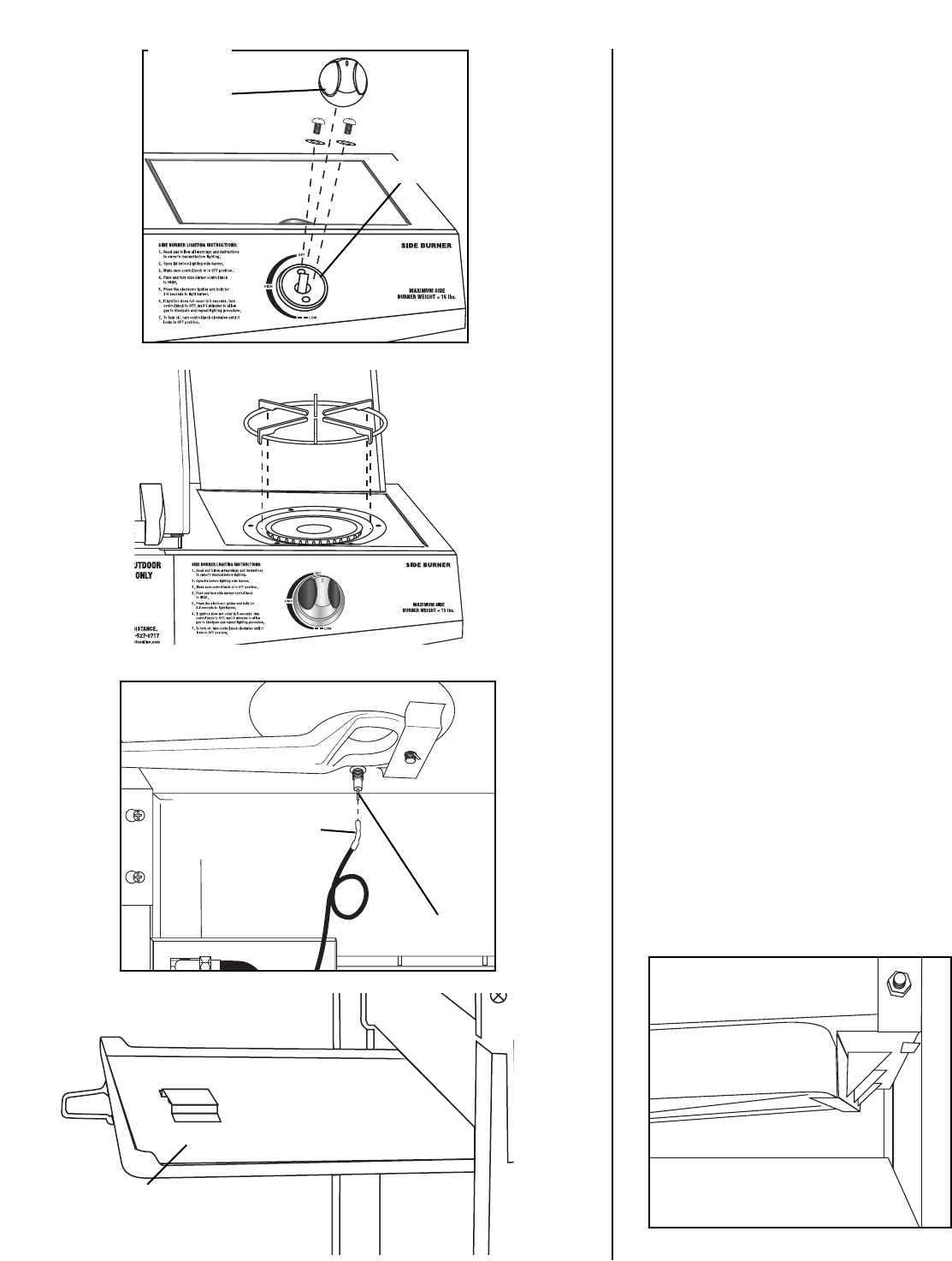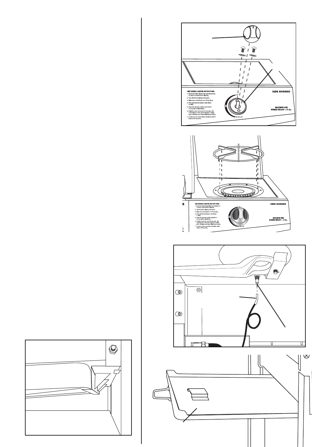 • Never place more than 15 pounds on the side burner. DO NOT lean on the side burner shelf.