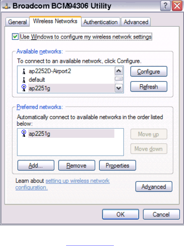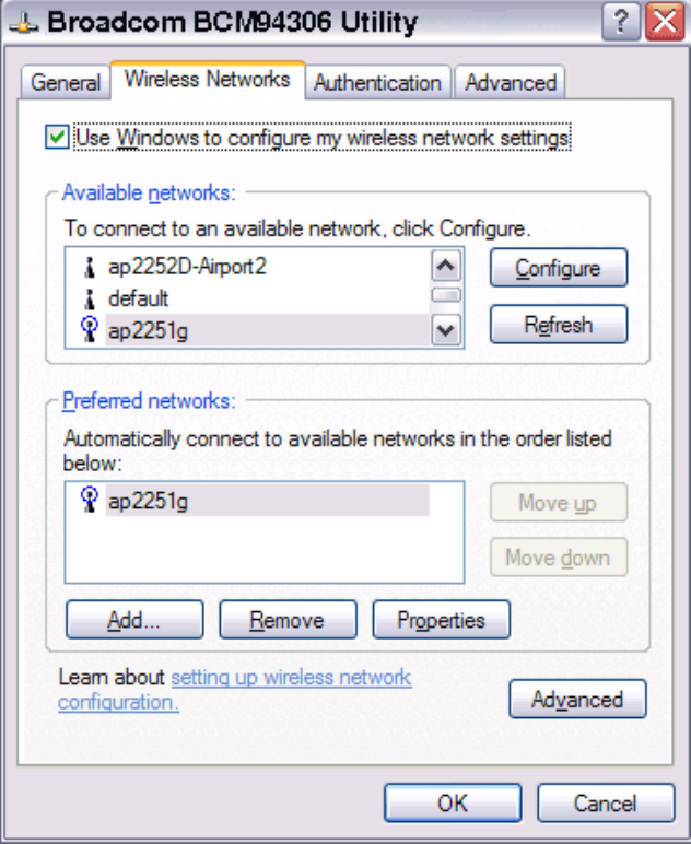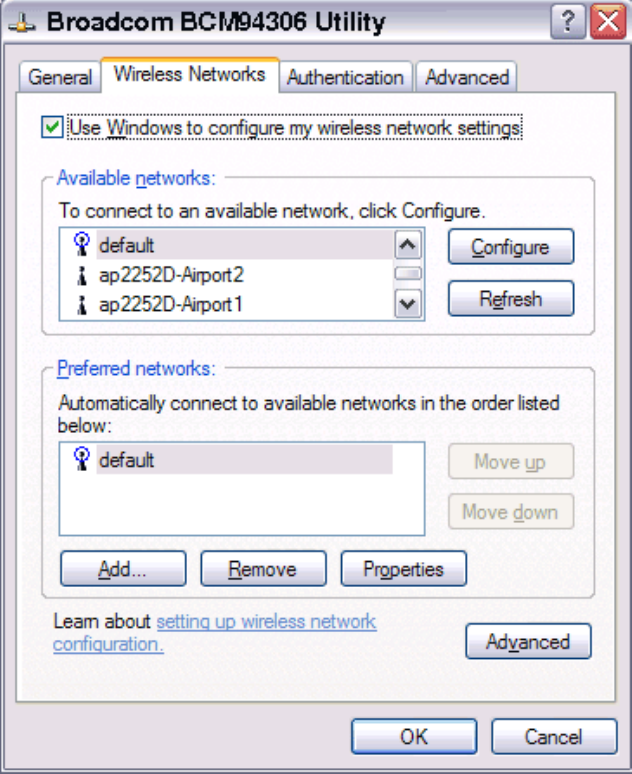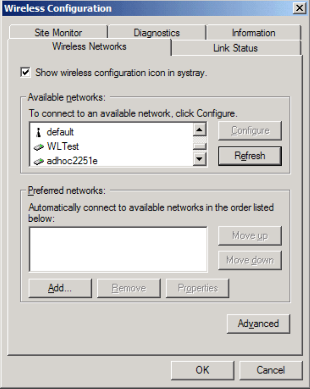 networks list on the Wireless Networks tab of the Wireless Configuration box when the