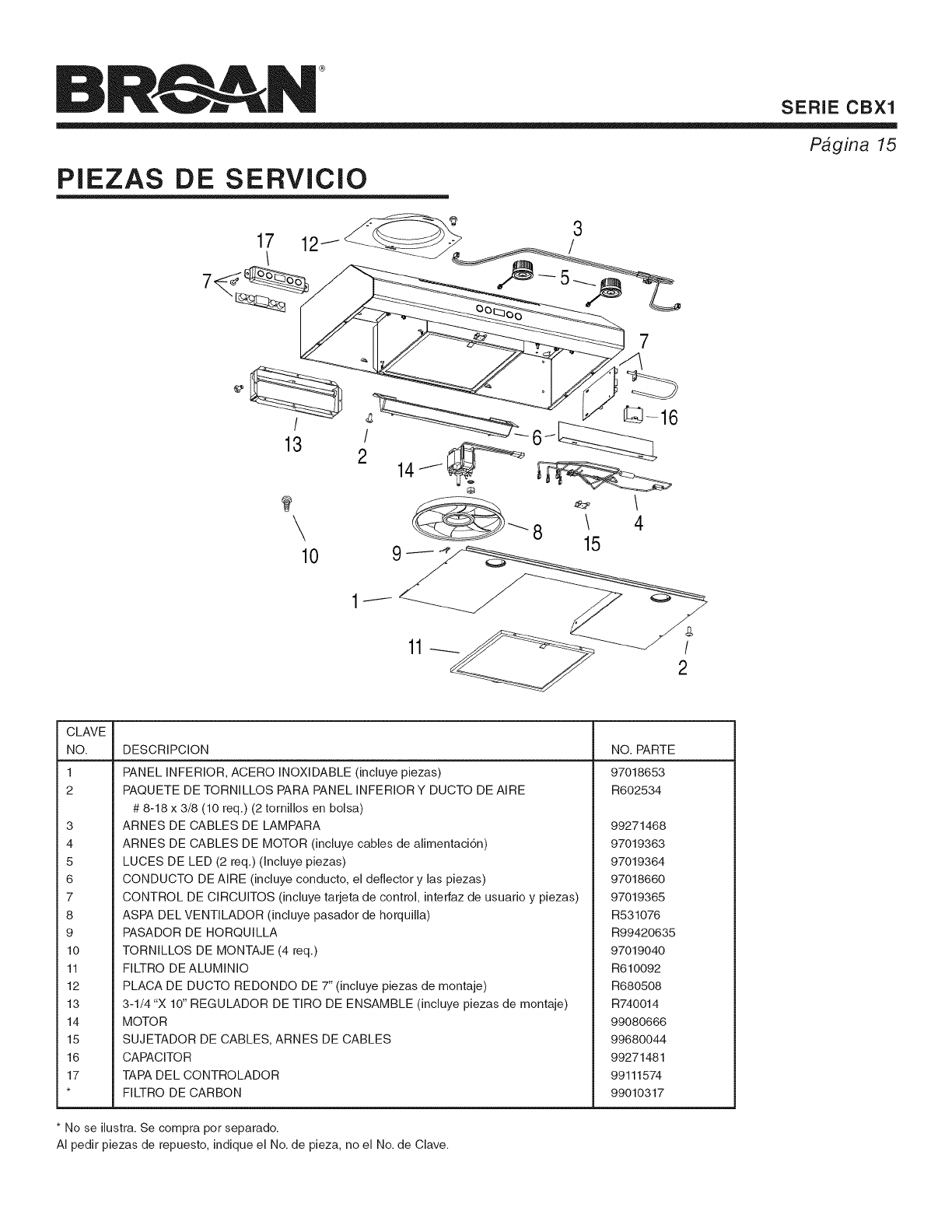 AI pedir piezas de repuesto, indique el No. de pieza, no el No. de Clave.