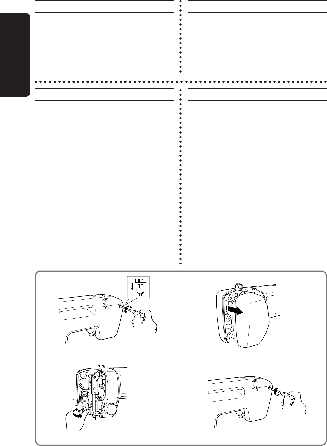 15. Toujours débrancher la machine à coudre avant de retirer les plaques de protection, de la graisser ou avant d’effectuer toute