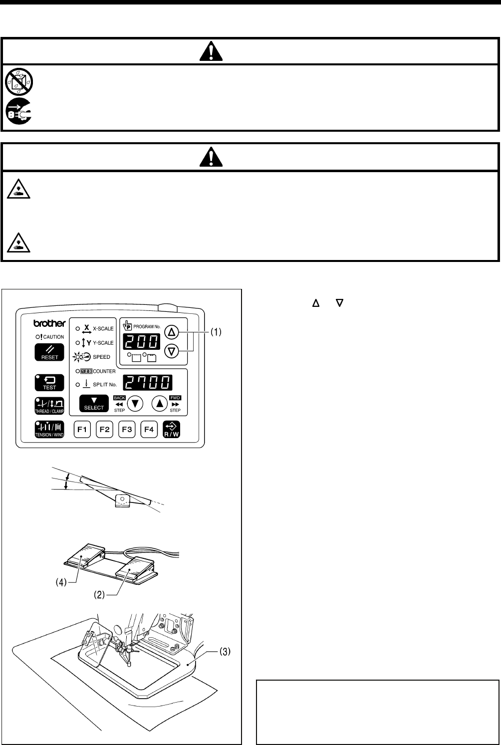 Do not touch any of the moving parts or press any objects against the machine while sewing, as this may result in
