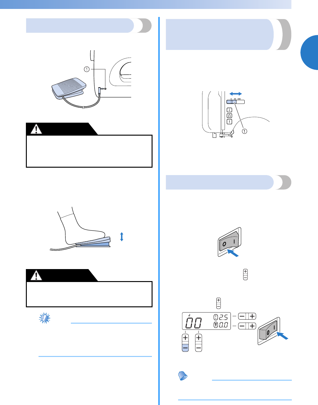 • Keep fingers away from all moving parts. Special care is required around the machine needle.