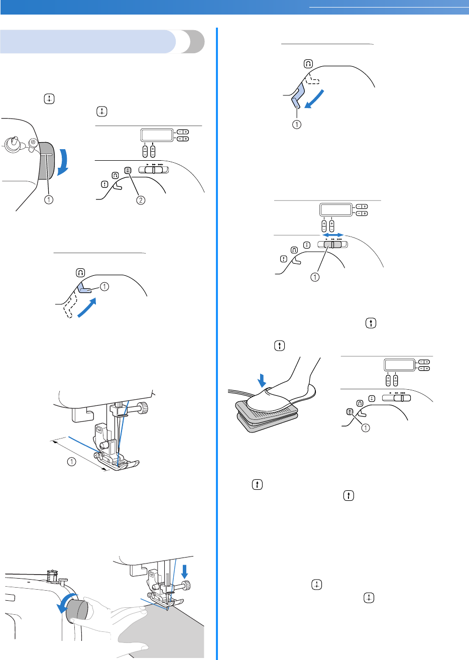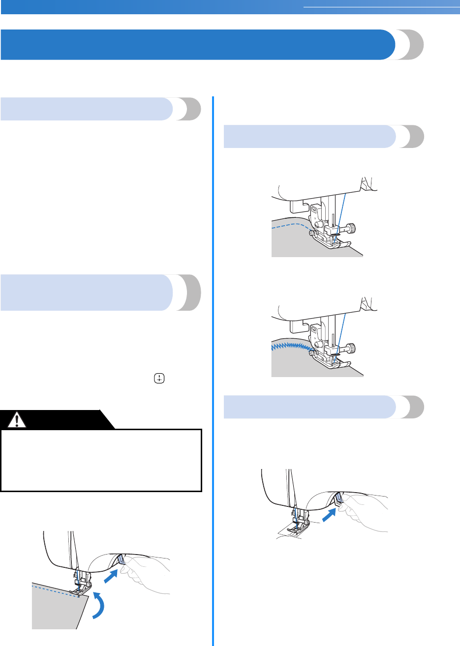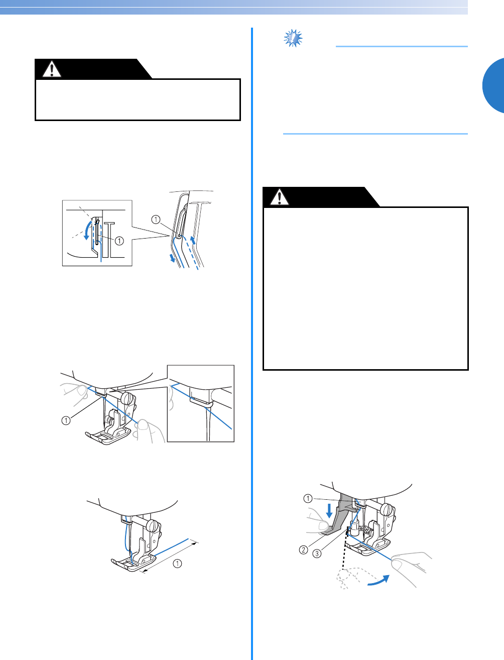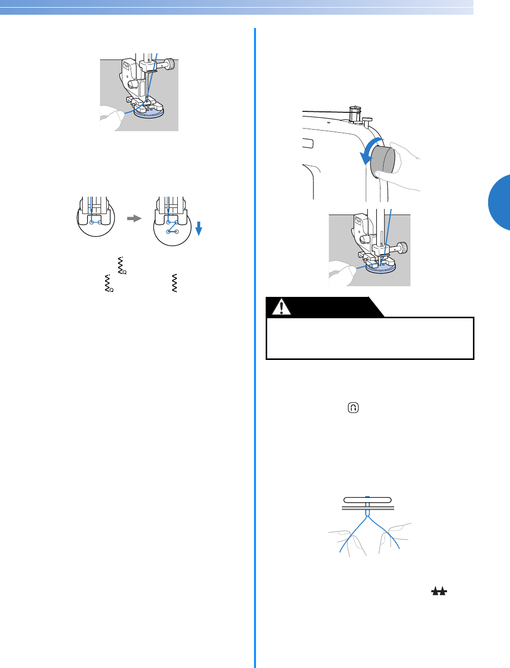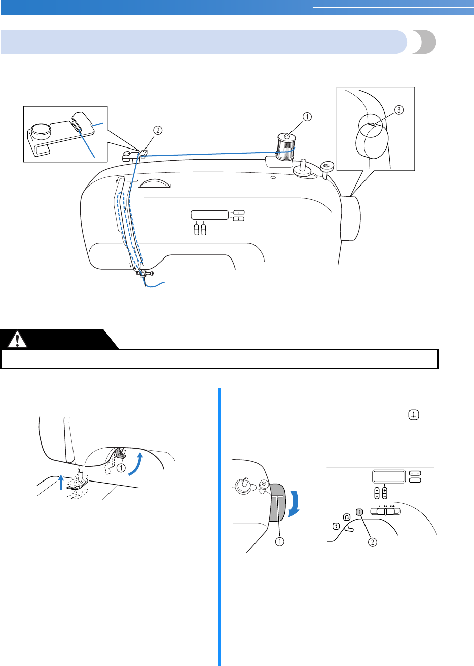 1. Be sure to keep your eye on the needle while sewing. Do not touch the hand wheel, thread take-