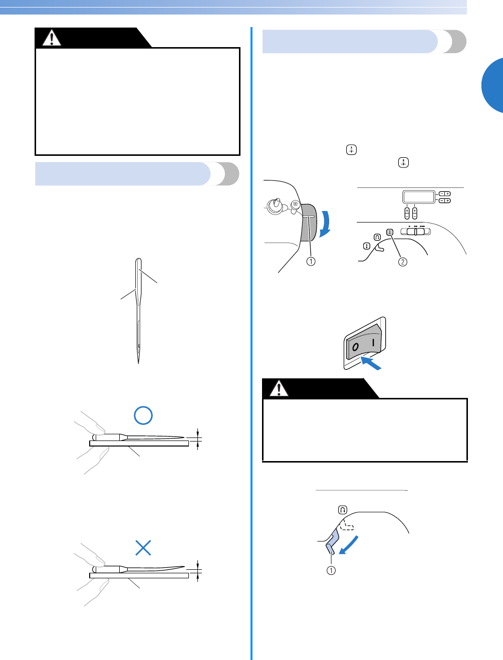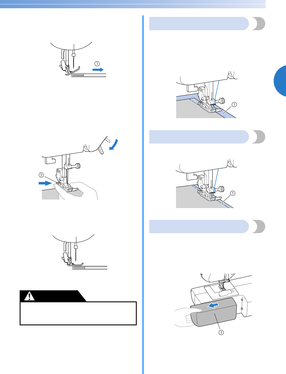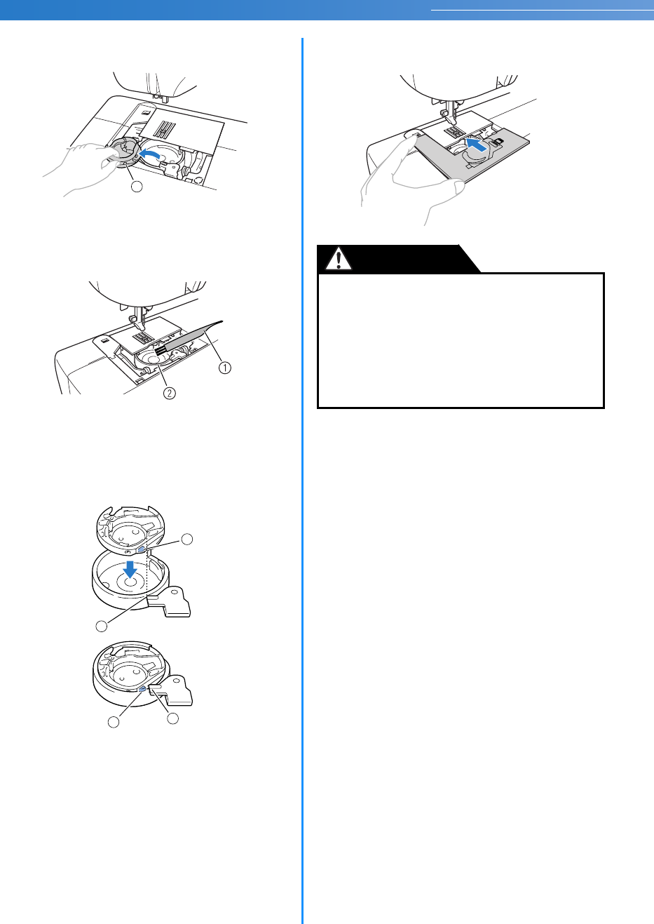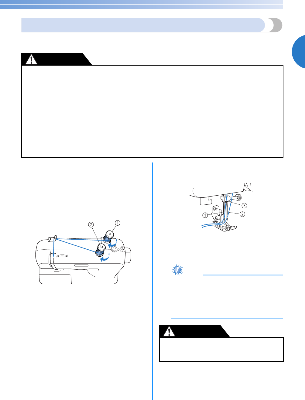 1. Be sure to keep your eye on the needle while sewing. Do not touch the hand wheel, thread take-