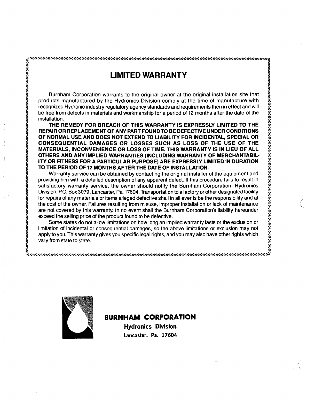 satisfactory warranty service, the owner should notify the Burnham Corporation, Hydronics