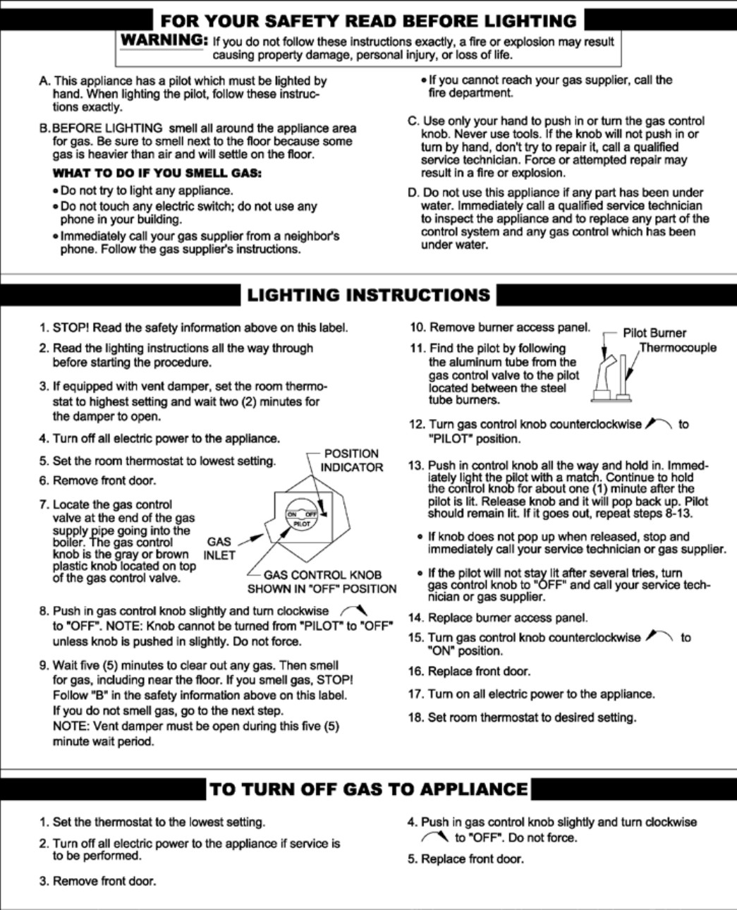 Keep boiler area clear and free of combustible materials, gasoline and other ammable vapors and liquids.