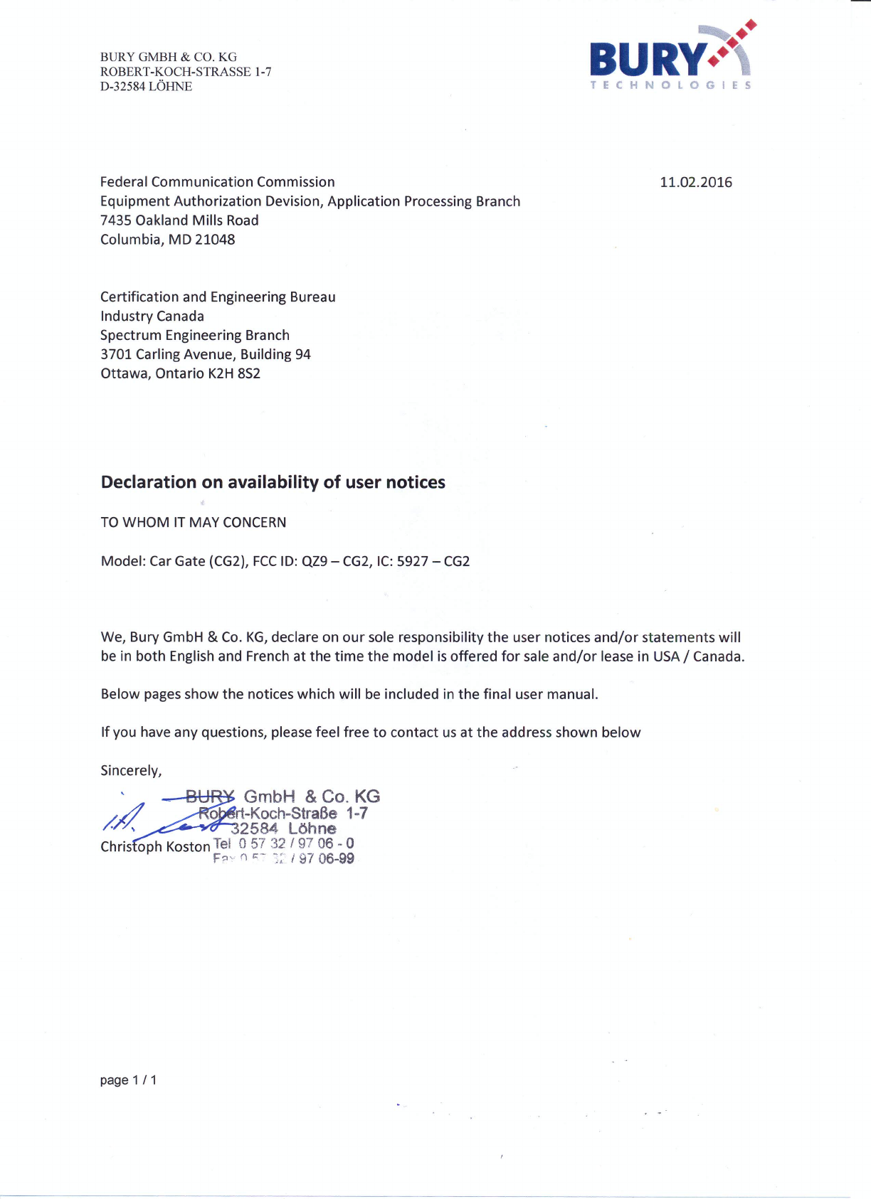 Bury and Co KG CG2 Control Unit for TSR about BT communication User Manual UserManual