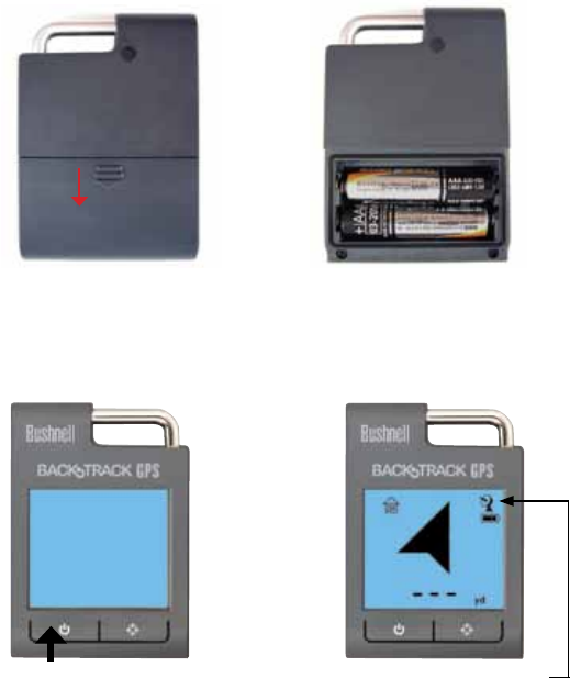 1. Open the battery cover on the back of the BackTrack (slide it down as shown by the arrow, then lift it straight up), insert