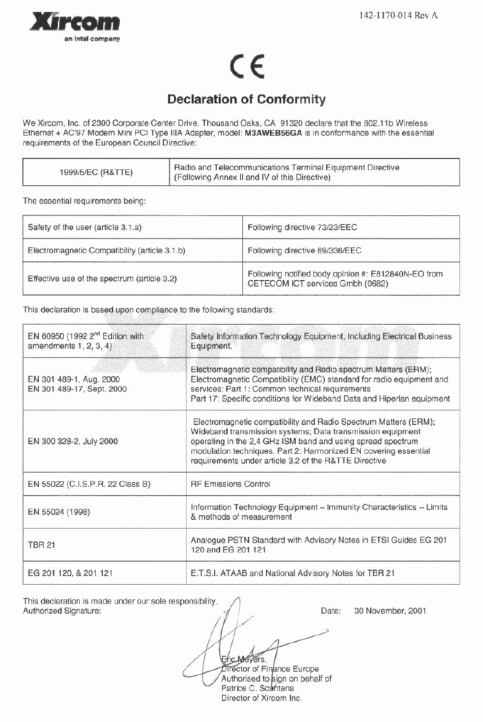 Wireless 802.11b est conforme aux exigences essentielles et aux autres