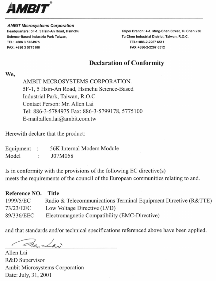 Europe — EU Declaration of Conformity for Ambit 56K Internal Modem