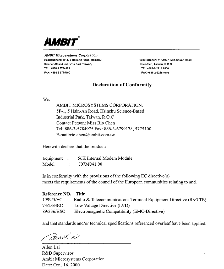 Hereby Ambit declares that this “J07M041.00”modem is in conformity with