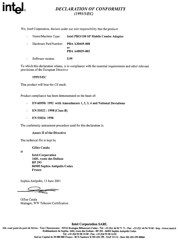 Hereby Intel declares that this “PBA A30469”or “PBA A48829”modem is in
