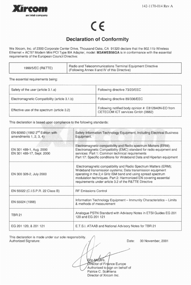 • Par la présente Intel déclare que l’appareil IBM High rate wireless LAN mini