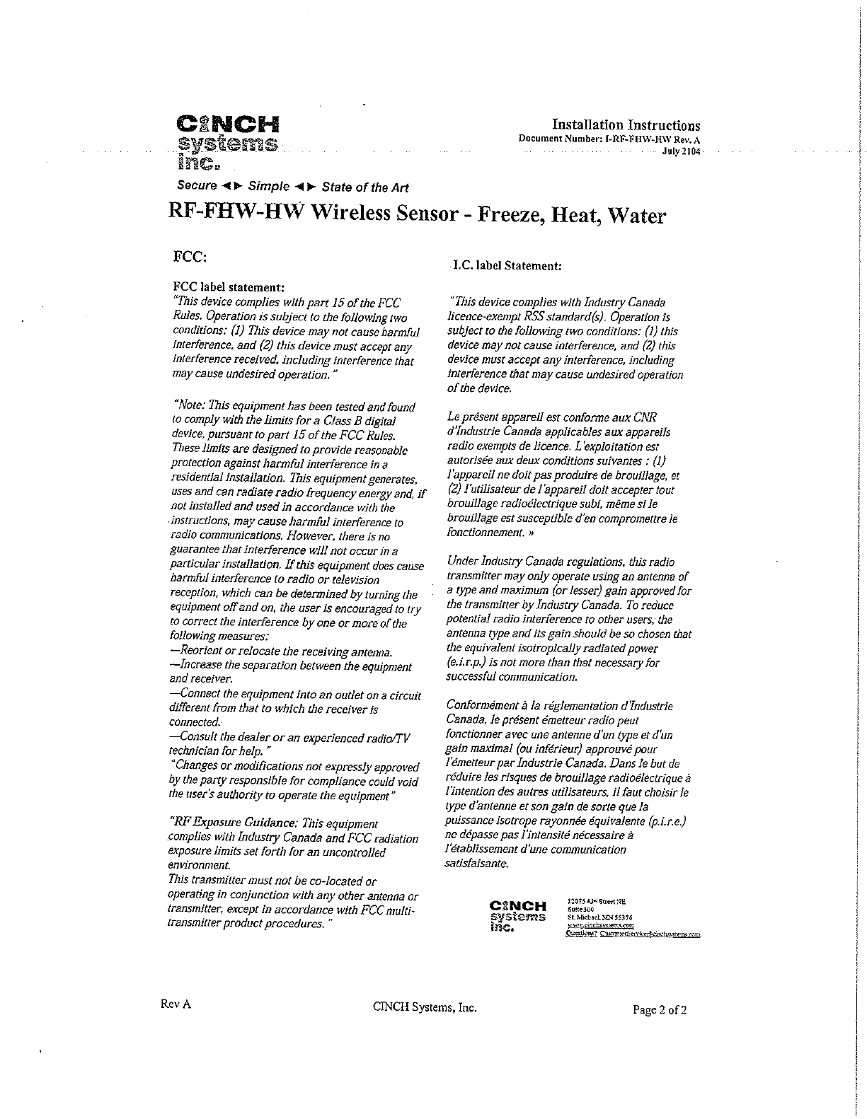Cinch Systems, Inc Door/window Sensors used by Security System I RF FHW HW Rev A Installation Manual