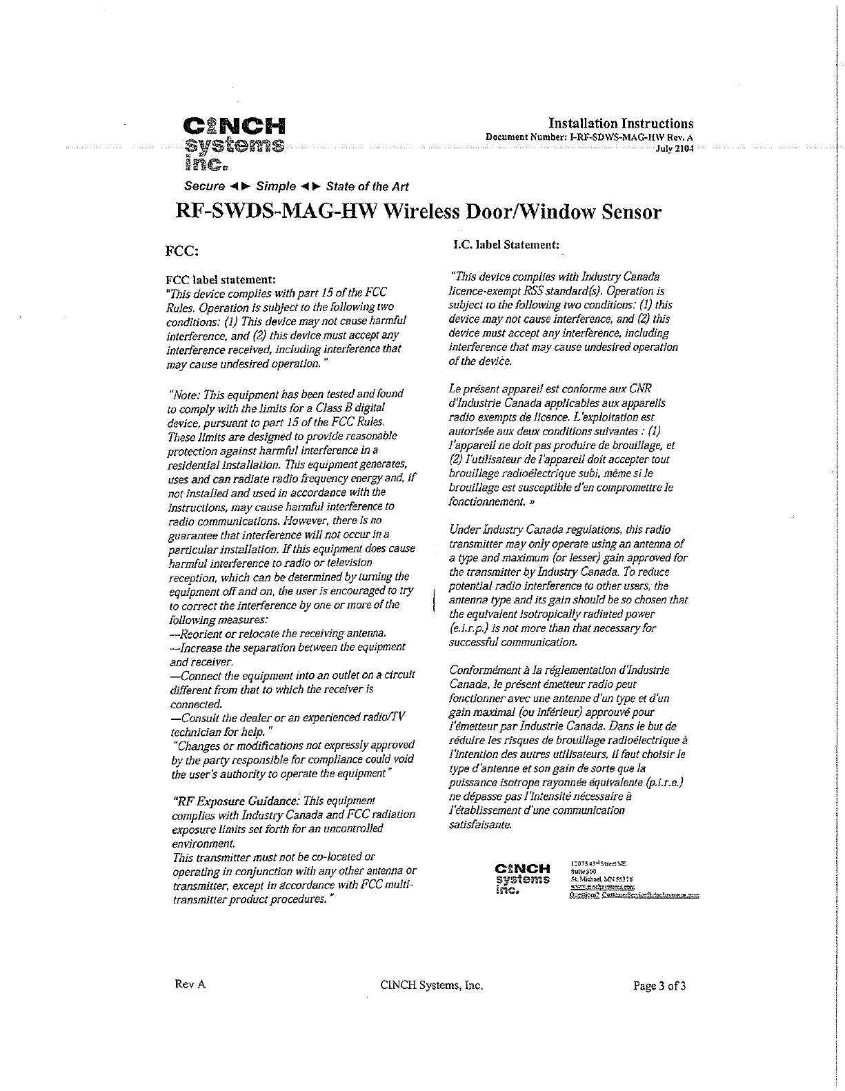 Cinch Systems, Inc Door/window Sensors used by Security System I RF SDWS MAG HW Rev A Installation Manual