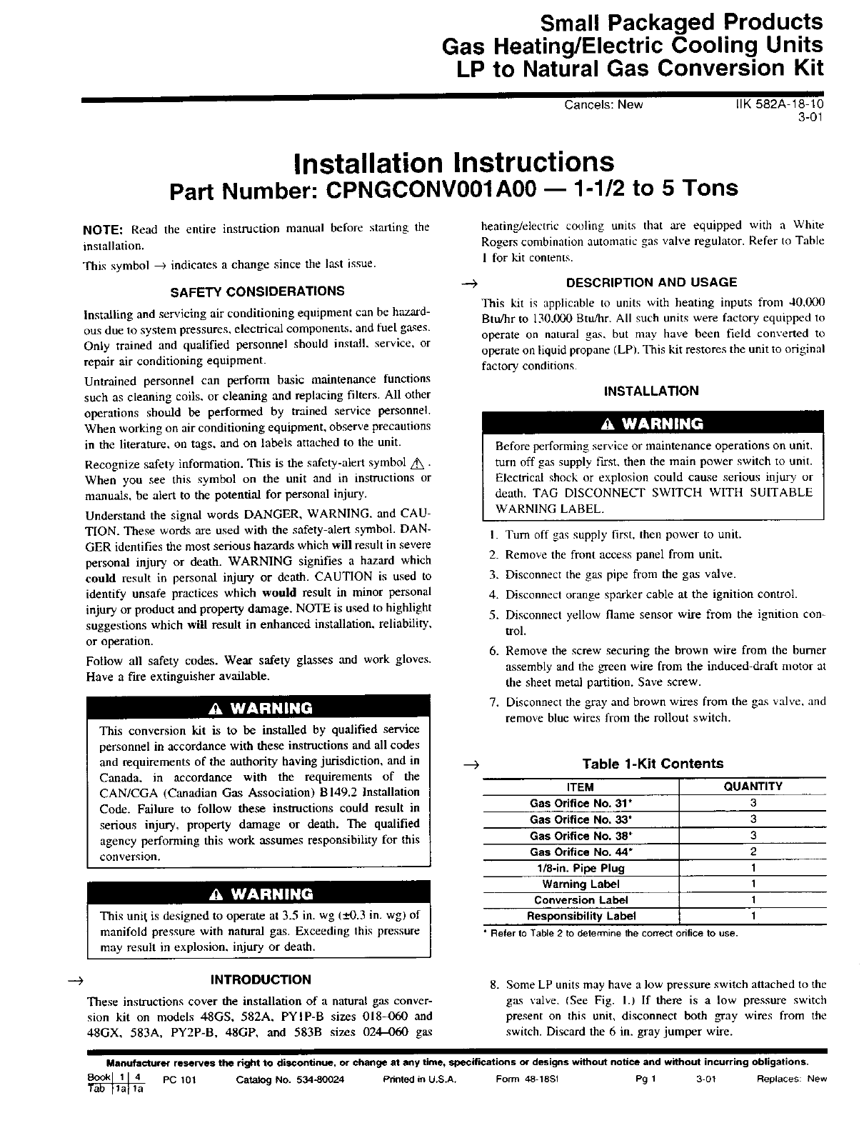 PC t0t Catalog No. 534-80024 Pdnted in U.S.A. Form 48-18Sl Pg 1 3-01 Replaces: New