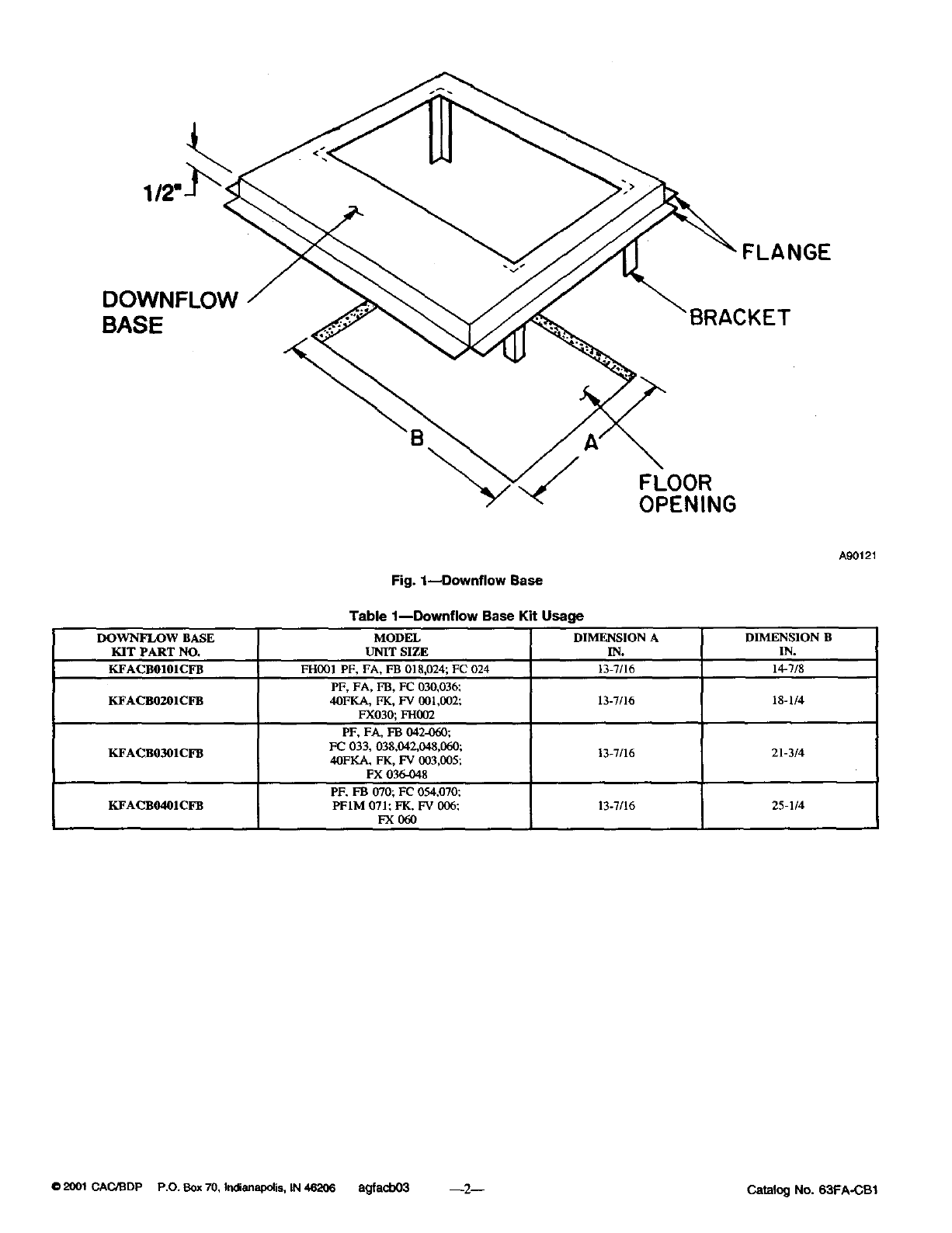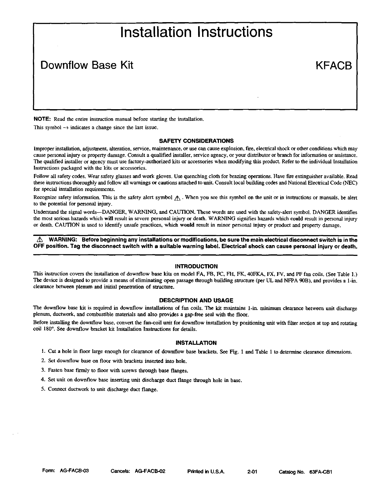 This instructioncovers the installation of downflow base kits on model FA, FB, FC, FH, FK, 40FKA, FX. FV, and PF fan coils. (See Table1.)