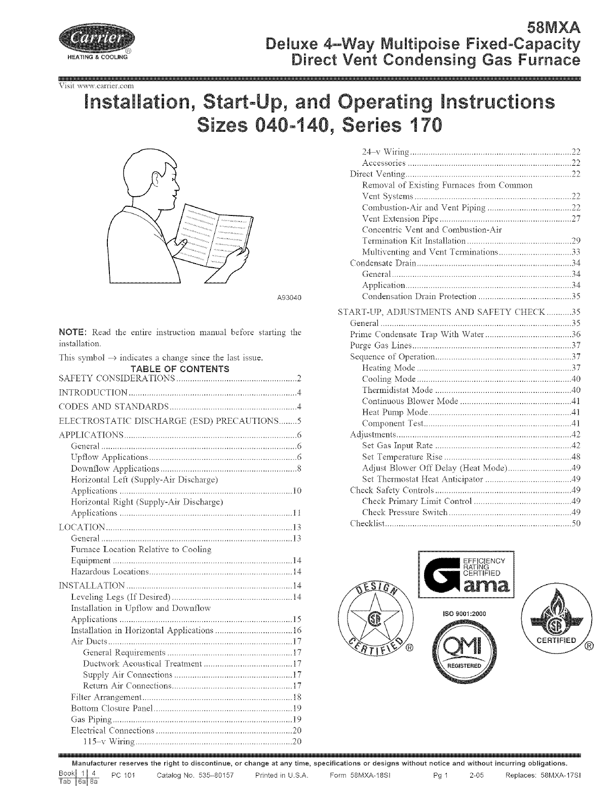 Copyright 2005 CARRIER Corp., 7310 W. Morris St • Indianapolis, IN 46231 58mxa18si