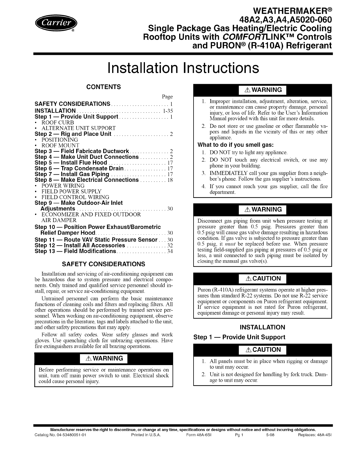 Catalog No. 04%3480051-01 Printed in U.S.A. Form 48A-6SI Pg 1 5-08 Replaces: 48A-4SI