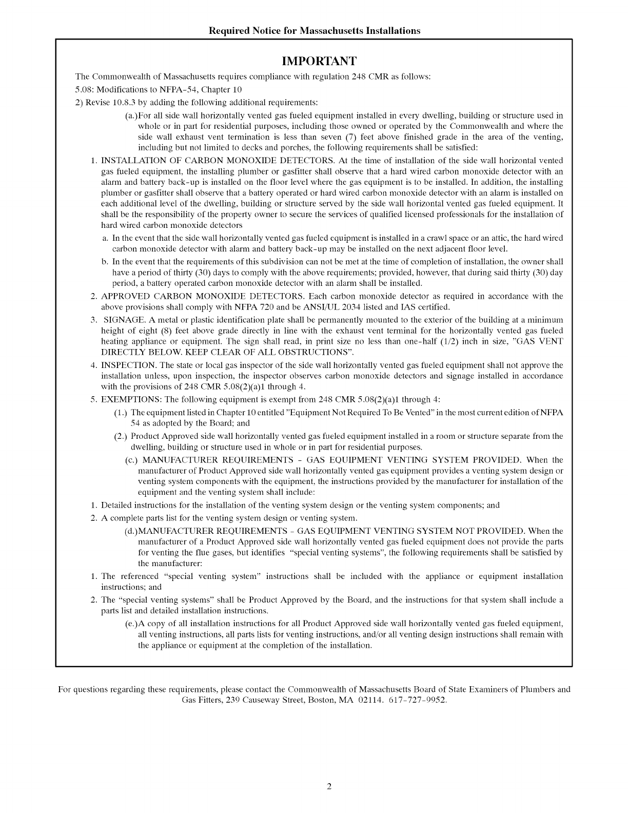 The Commonwealth of Massachusetts requires compliance with regulation 248 CMR as follows: