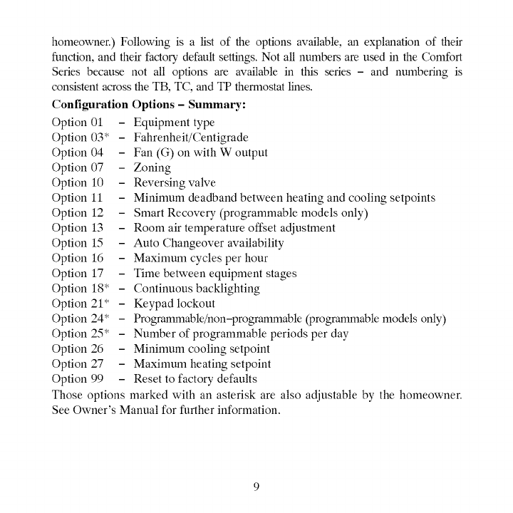 * Options with an asterisk can also be set/changed by the homeowner.