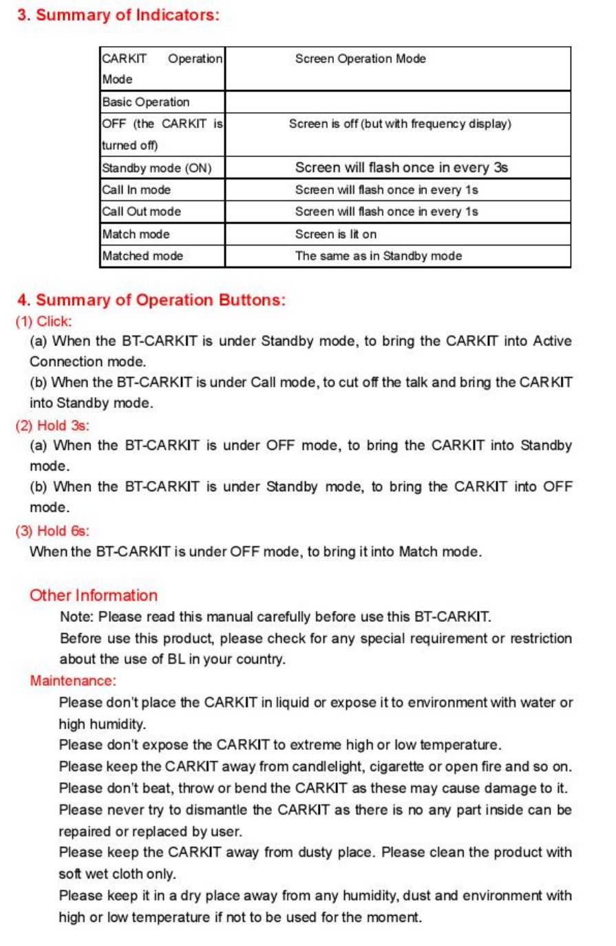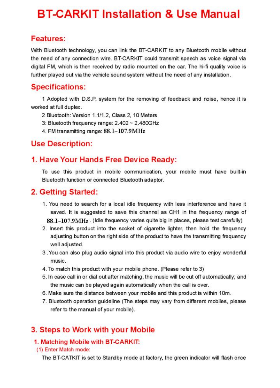 CCA Electronic Factory BH03875108 BLUETOOTH FM CAR KIT User Manual