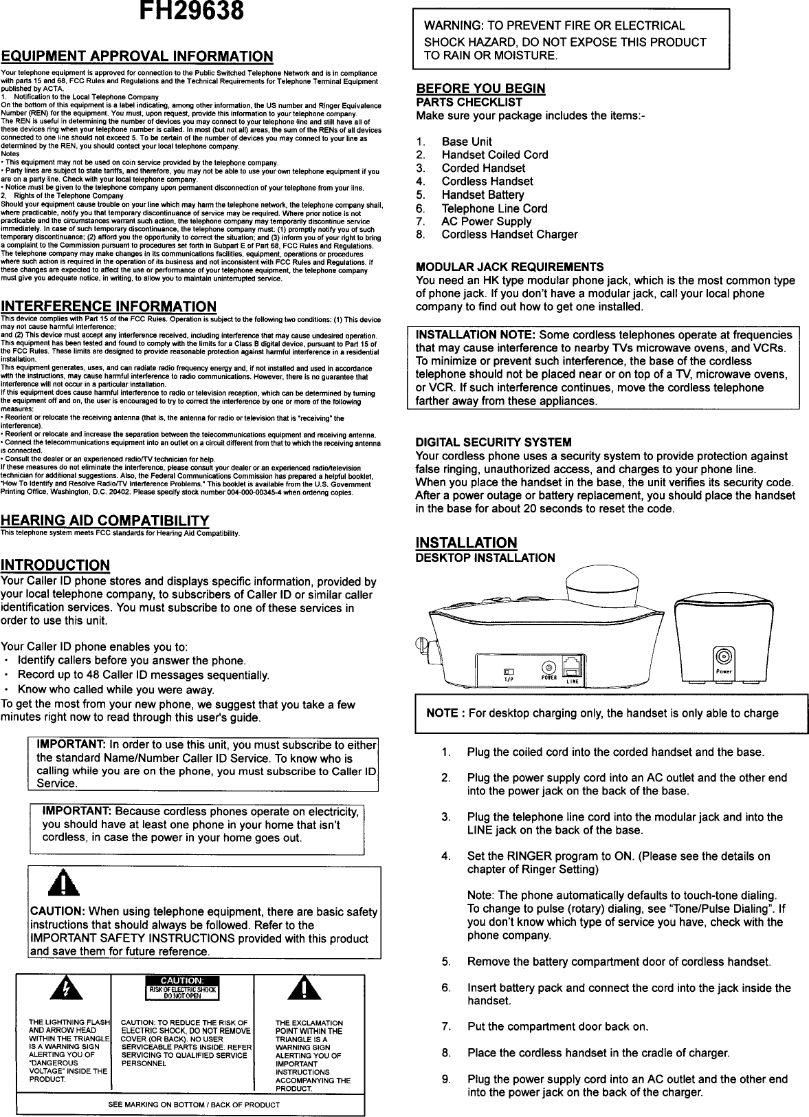 CCT Tech Advanced 2-9638 10 Channel Cordless Phone with Caller ID User Manual