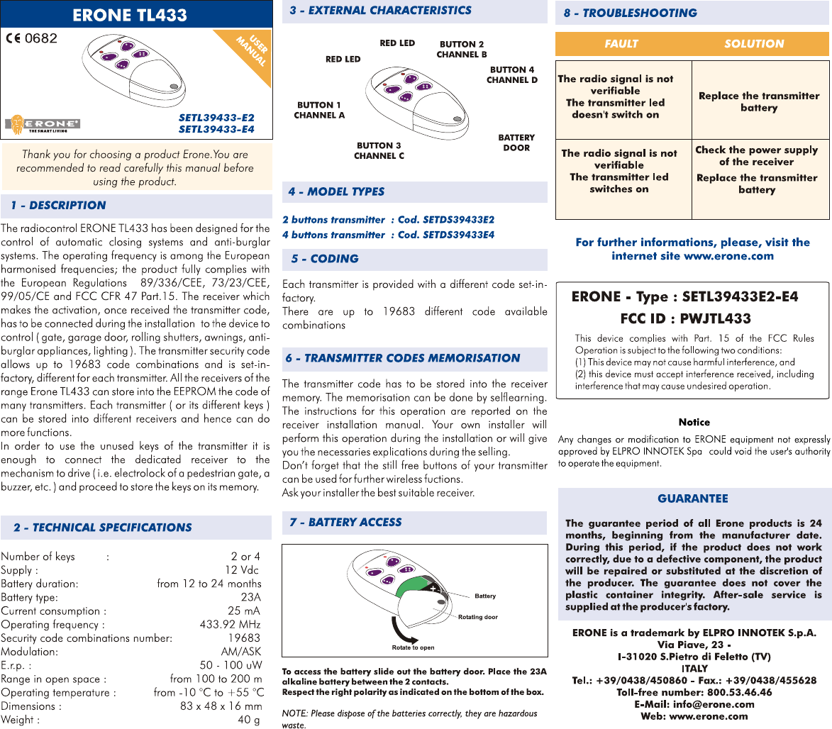 CDVI WIRELESS S P A TL433 TRANSMITTER ERONE MOD. TL433 User Manual istruzioni FCC
