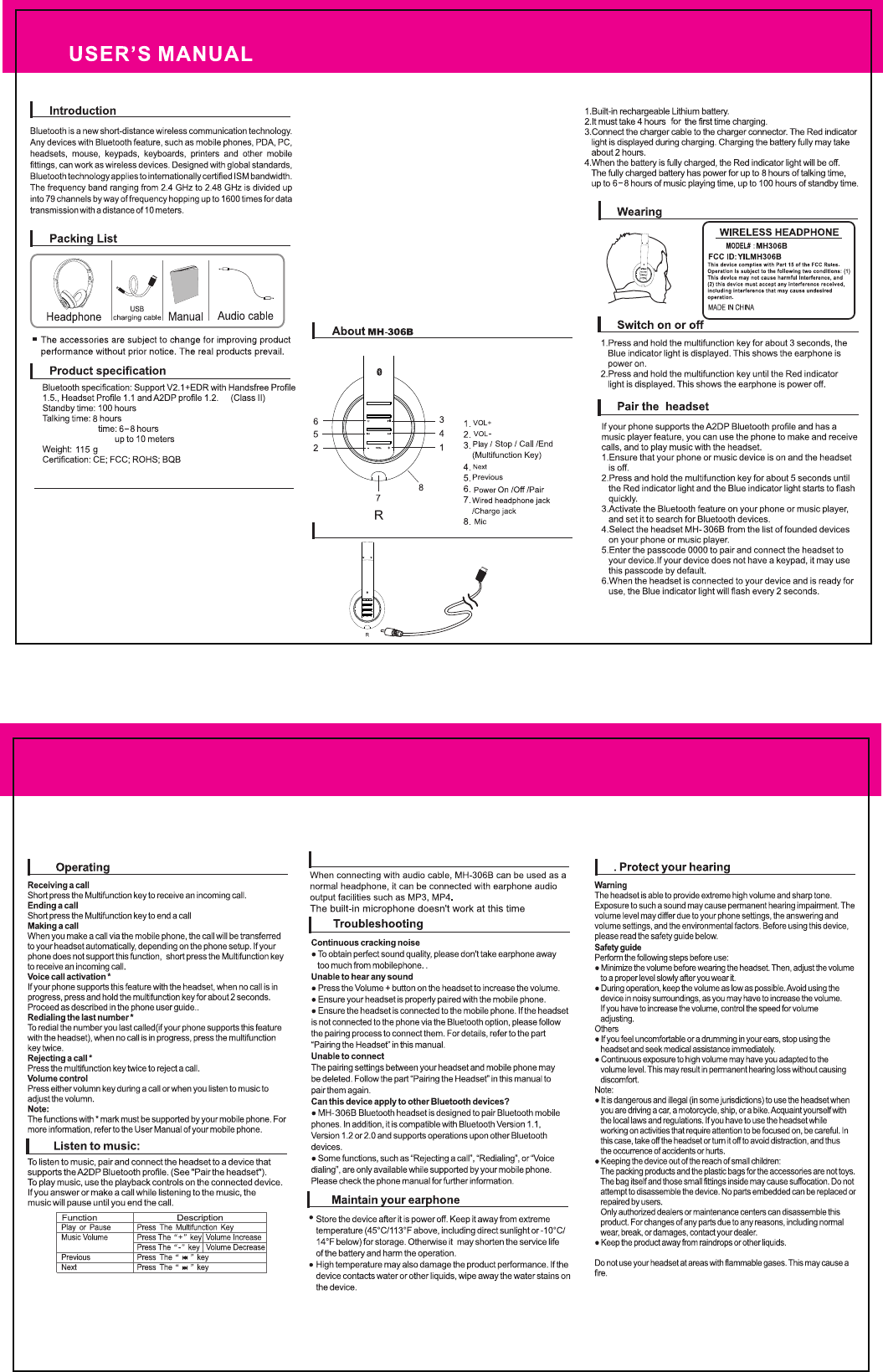 CHENGYAN SCIENCE and TECHNOLOGY MH306B Bluetooth headphone User Manual 306B manual 2