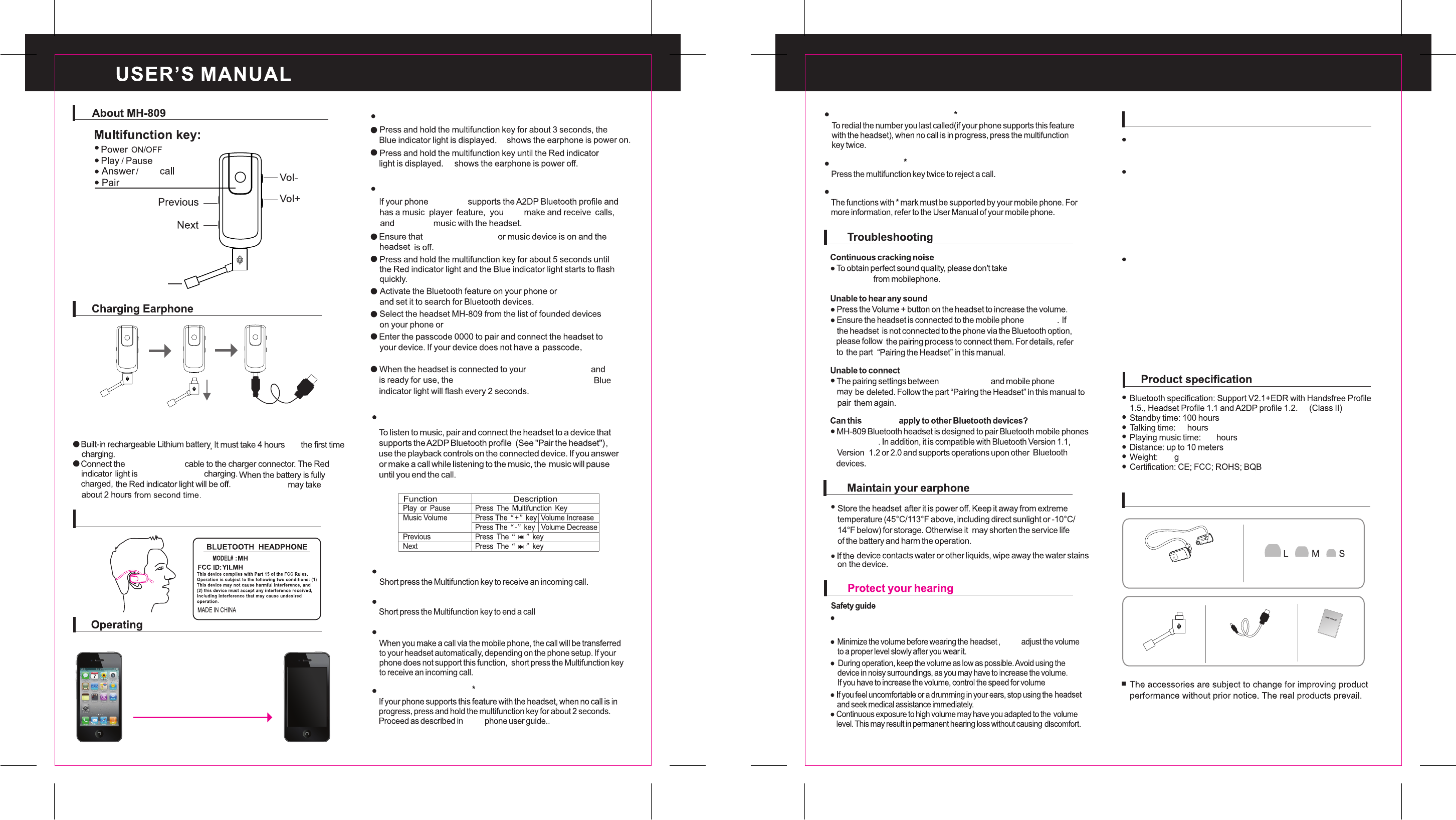 CHENGYAN SCIENCE and TECHNOLOGY MH809 Bluetooth Headphone User Manual MH 809 FCC