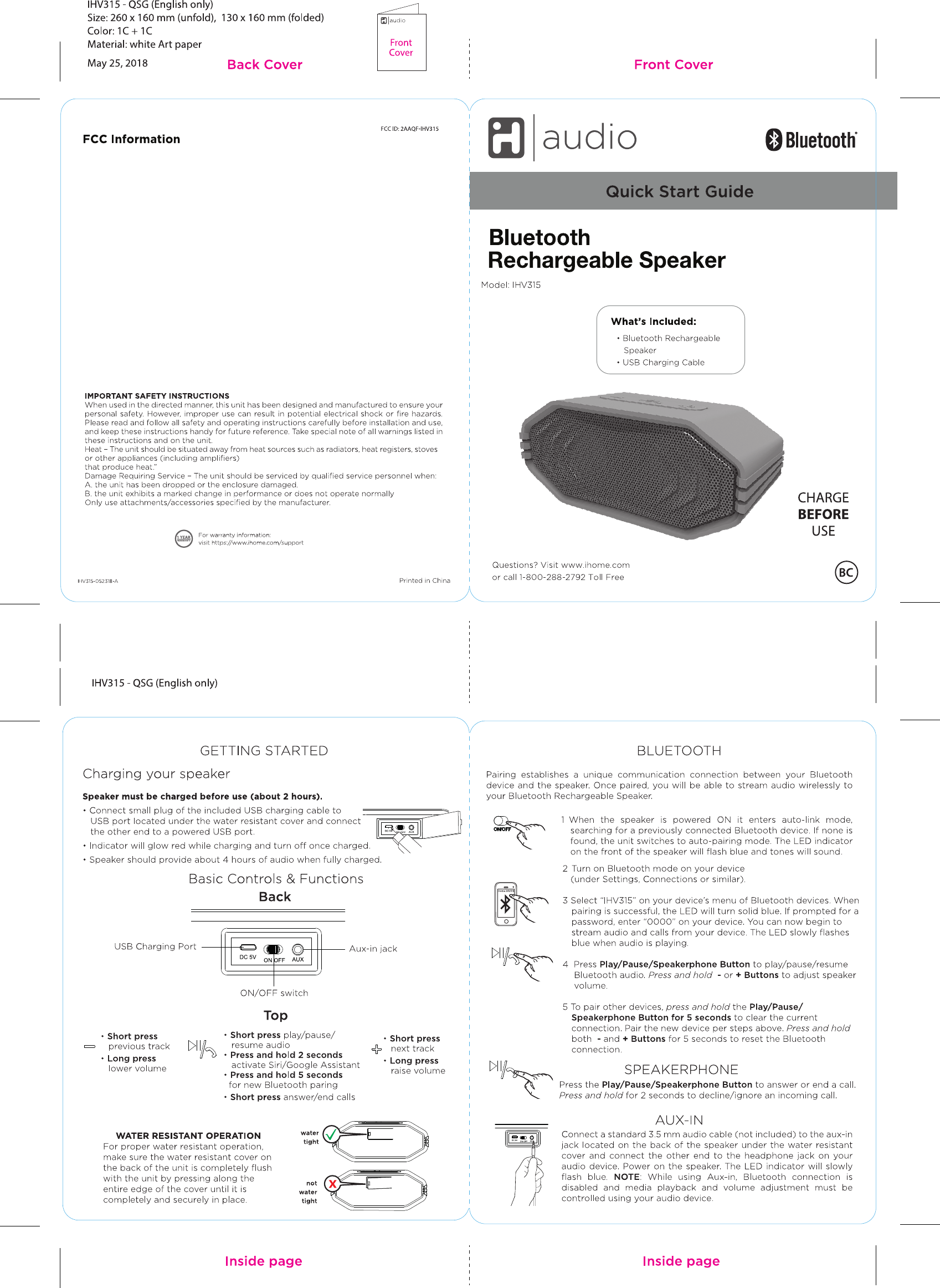 CHINA ELECTRONICS IHV315 Bluetooth Rechargeable Speaker User Manual