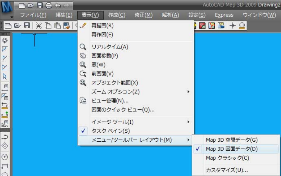 以下の説明ではメニューからの操作を中心に説明します。メニュー構成は、「Map 3D 図面データ」