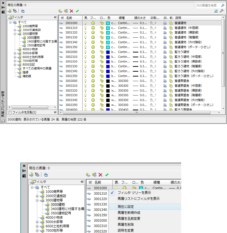 2. 「画層プロパティ管理」ダイアログで、これから作図する図式を選択します。上の例