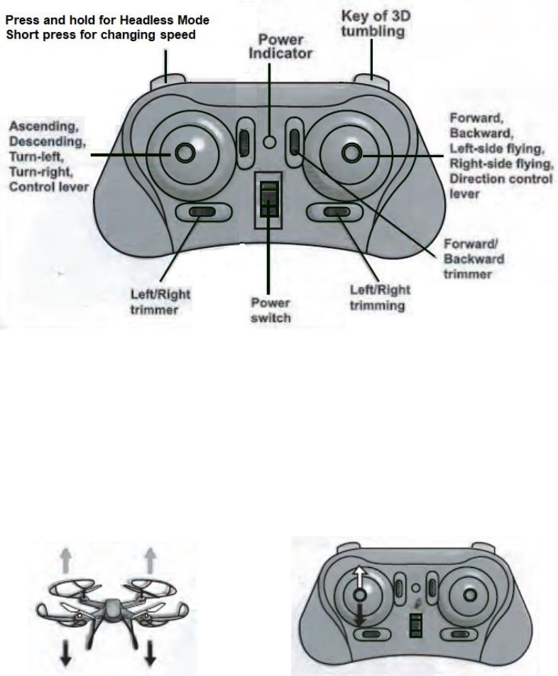 When you push the left throttle stick upward/downward, the Quadcopter will begin to ascend/descend.