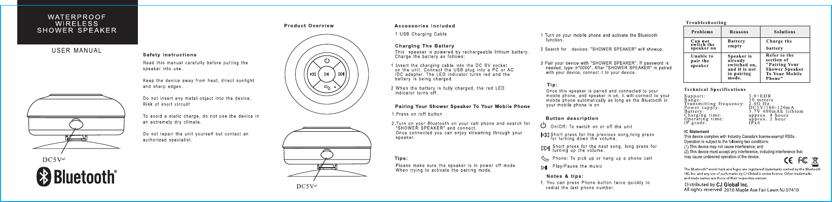 CJ Global 72XXX Wireless shower speaker User Manual Shower speaker FCC IC