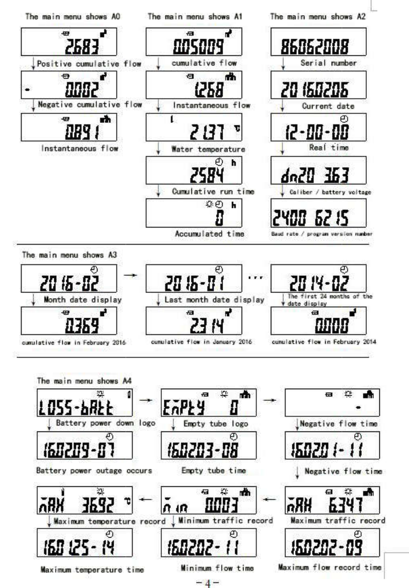 2. Main display menuA0:Accumulated flow (m3)、negative cumulative flow(m3)、