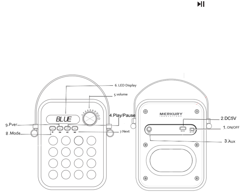 8. Mode: Press MODE button to change the audio source around Bluetooth/FM Radio