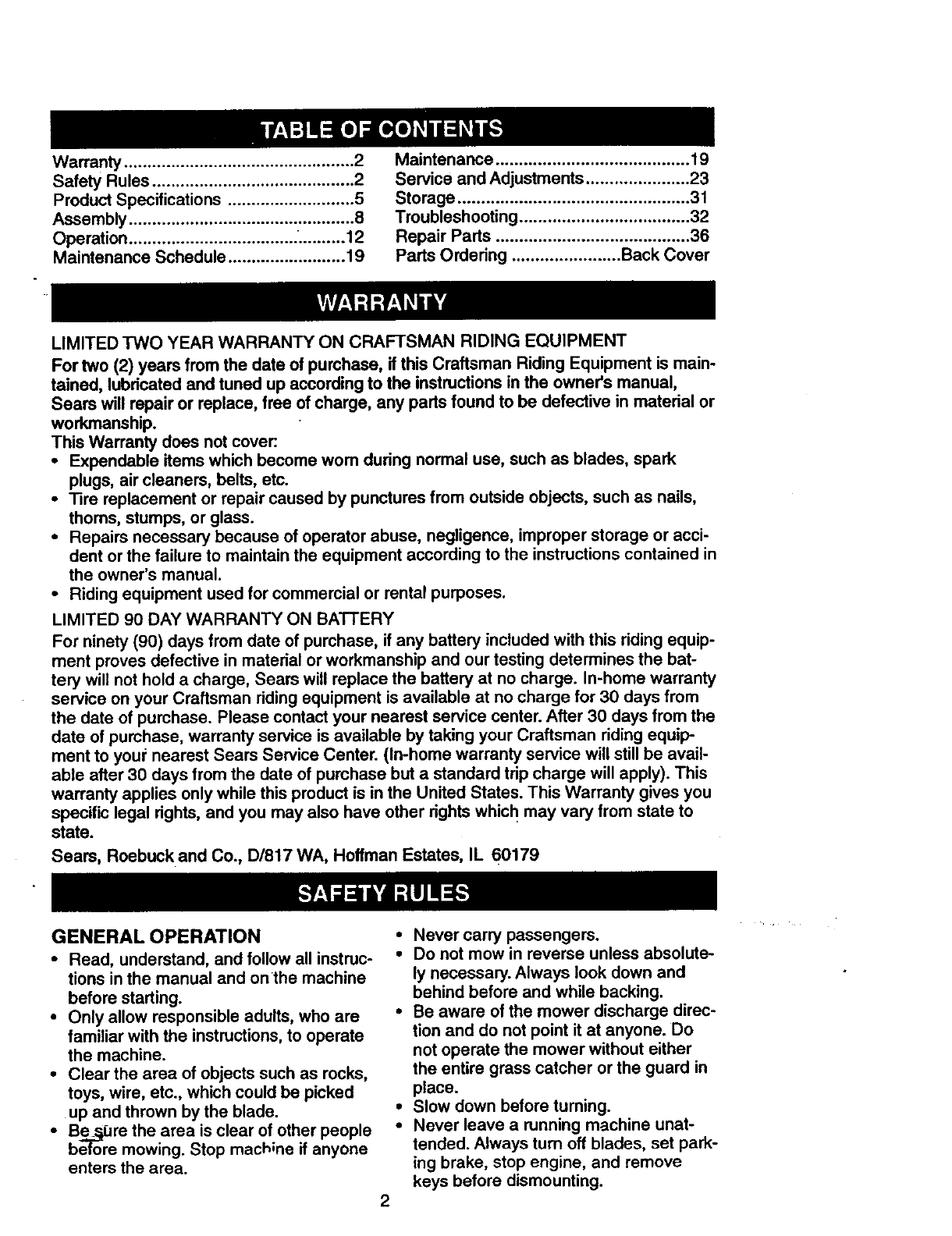 LIMITED TWO YEAR WARRANTY ON CRAFTSMAN RIDING EQUIPMENT
