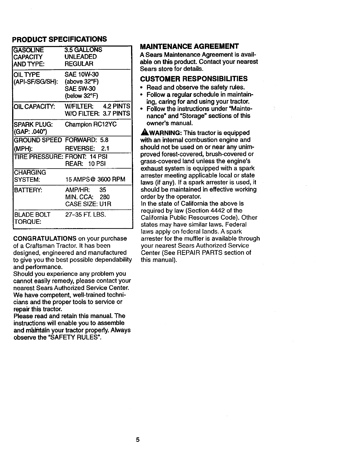CRAFTSMAN Lawn, Tractor Manual 98100315