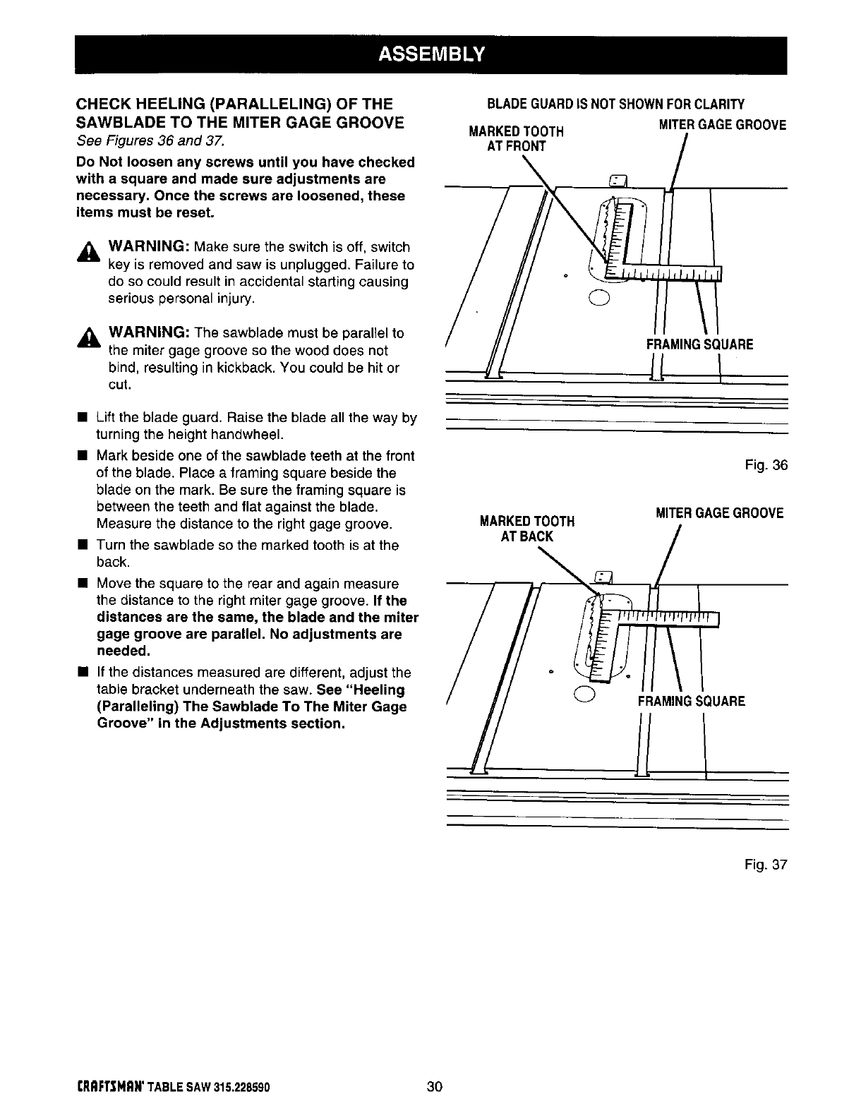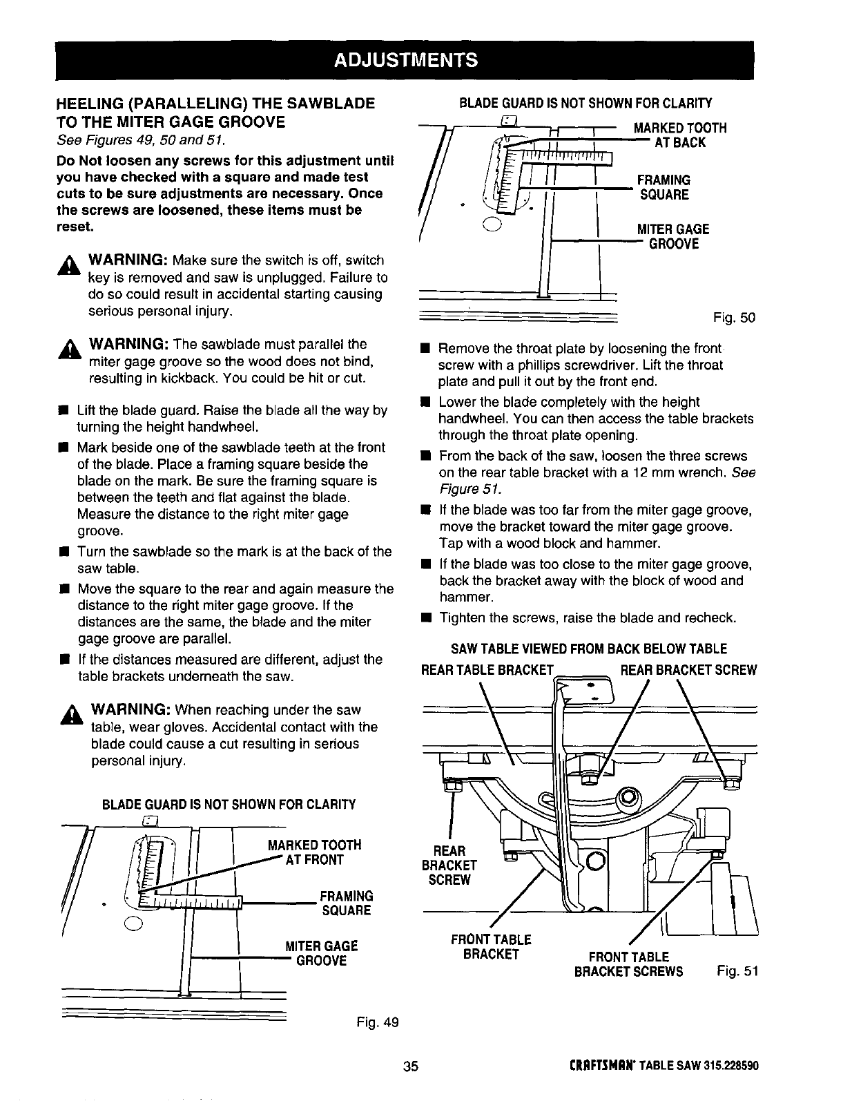 Heeling (Paralleling) the Sawblade to Miter Gage Groove .................................................................... 35