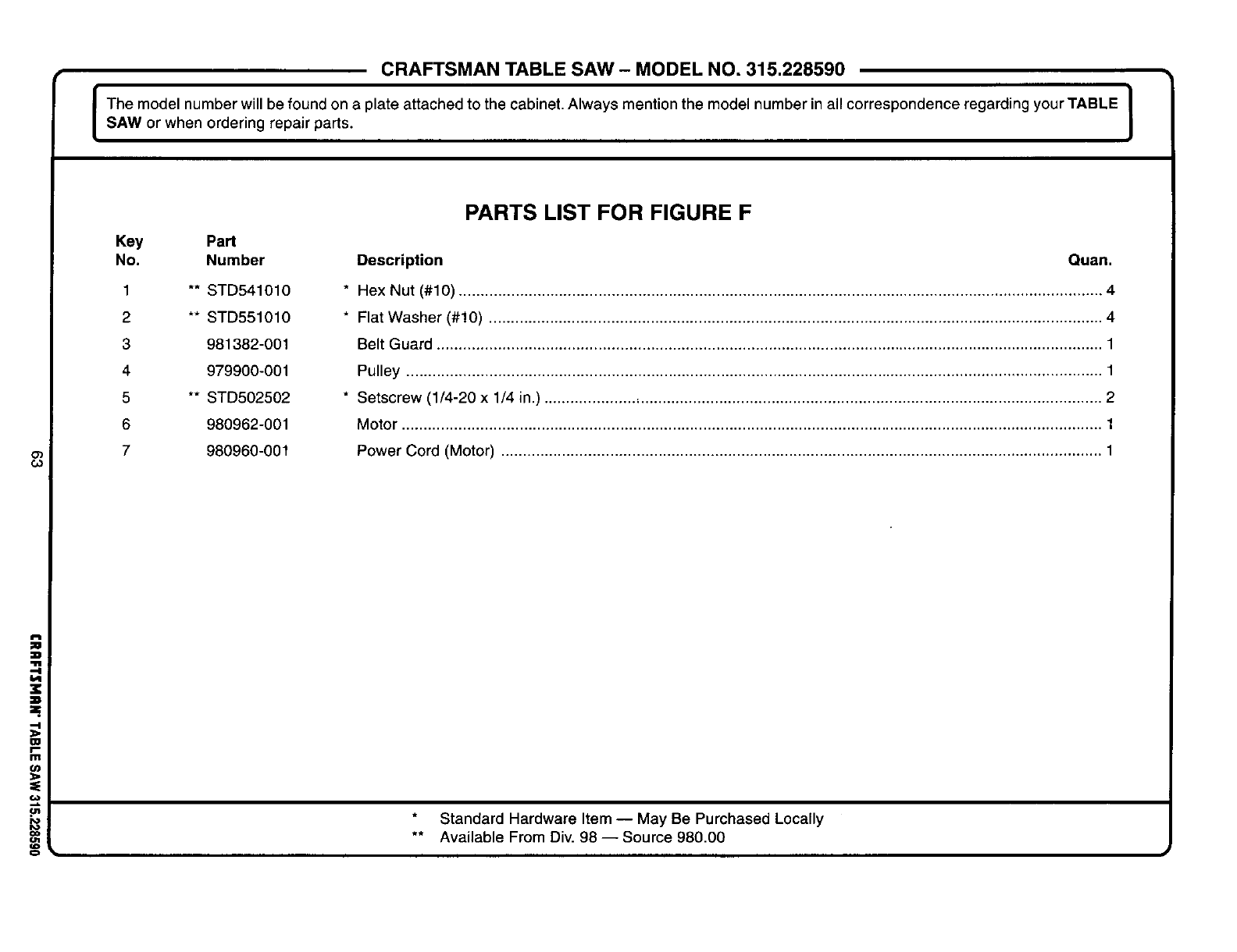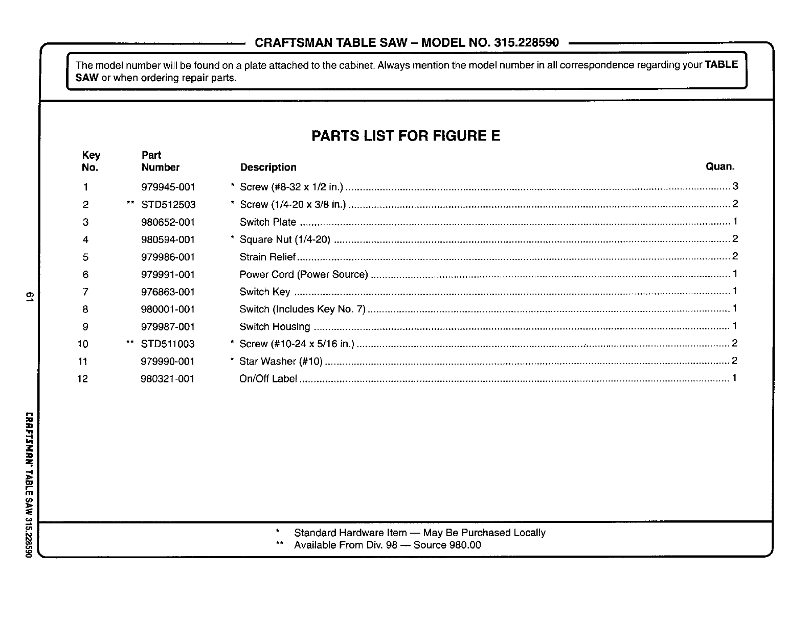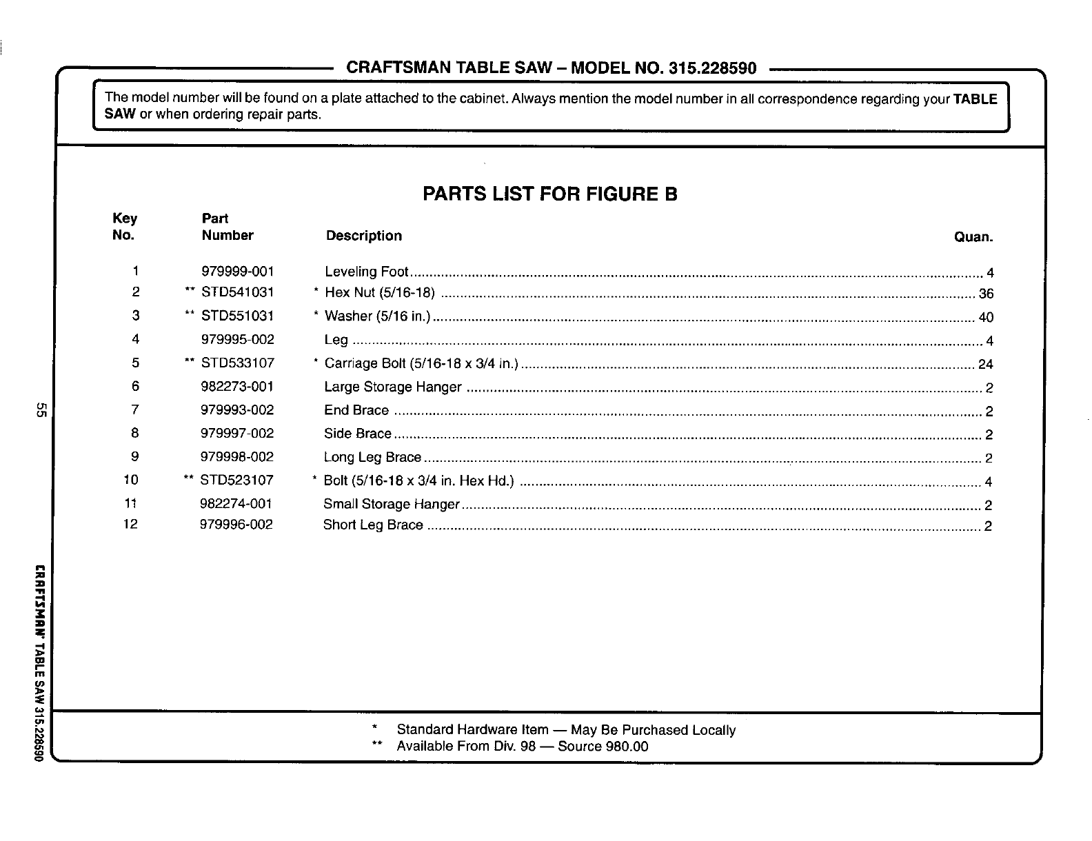 Standard Hardware Item -- May Be Purchased Locally ** Available From Div. 98 -- Source 980.00