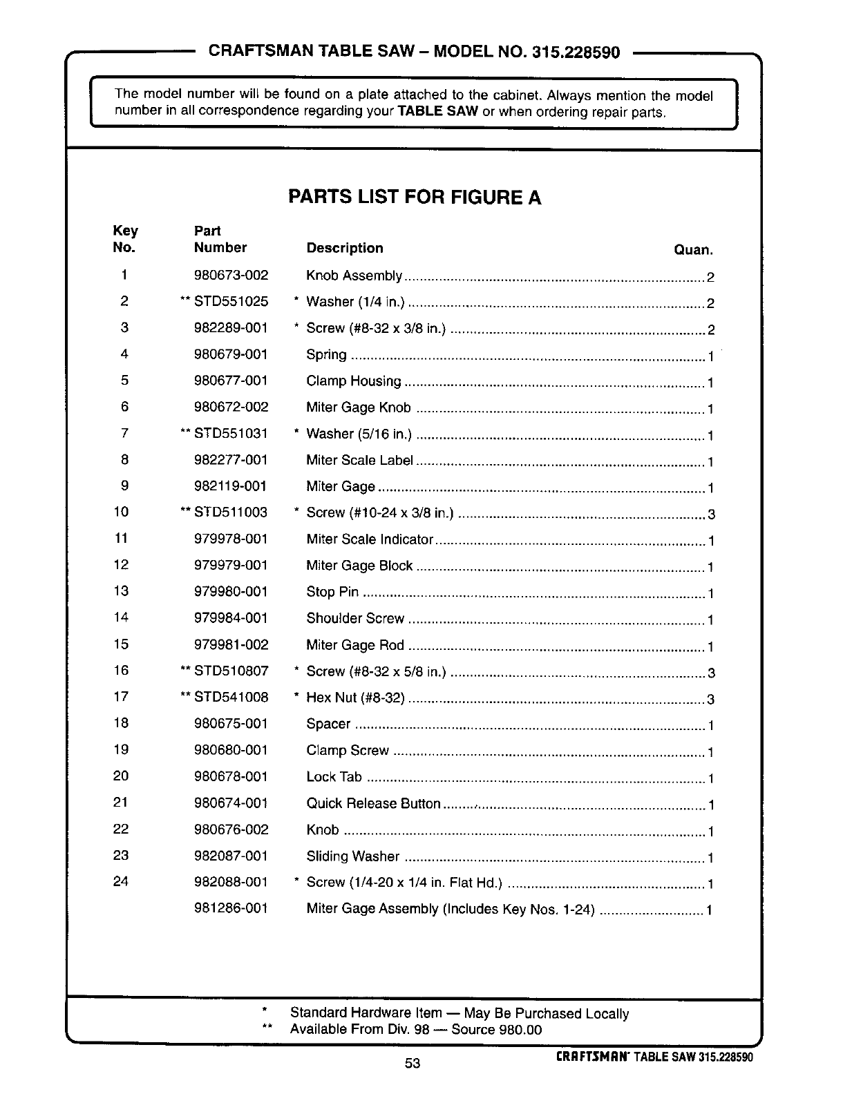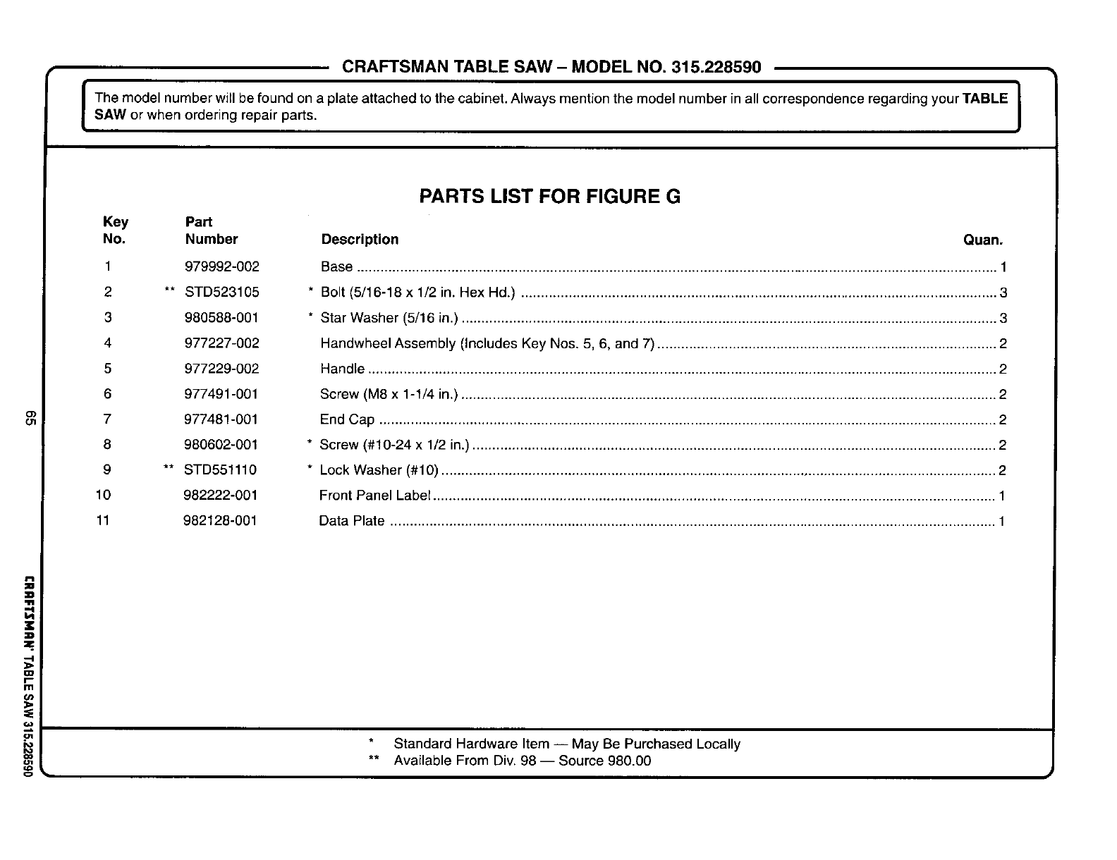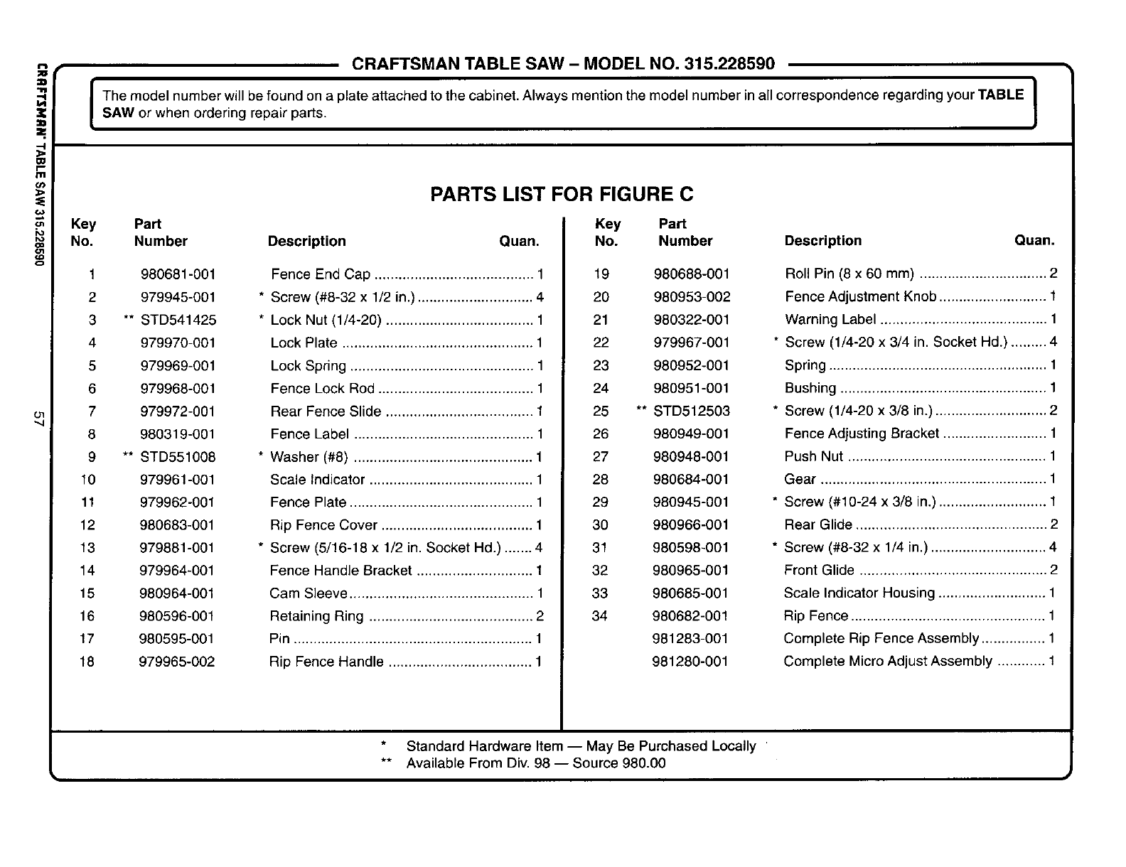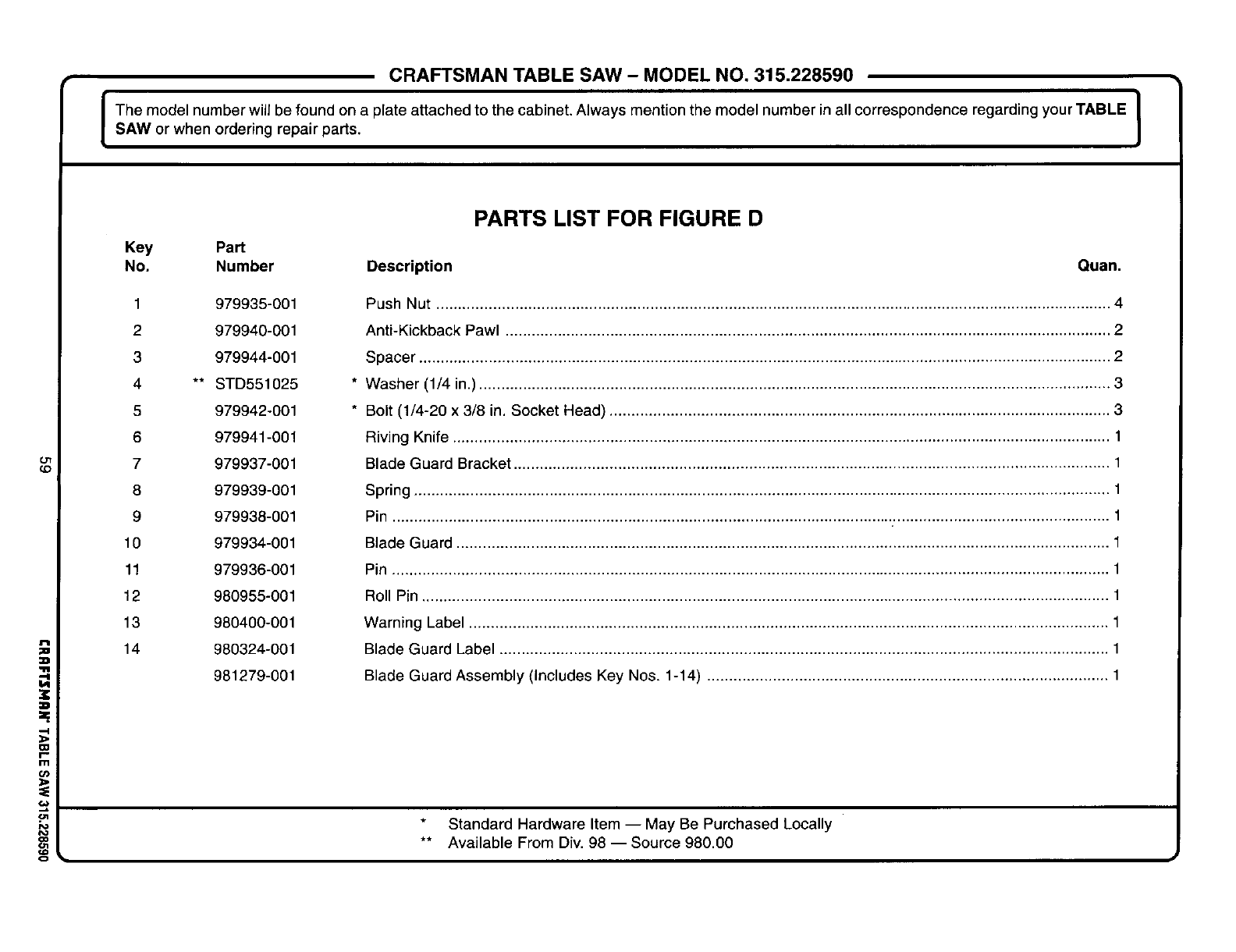 Standard Hardware Item -- May Be Purchased Locally ** Available From Div. 98 -- Source 980.00